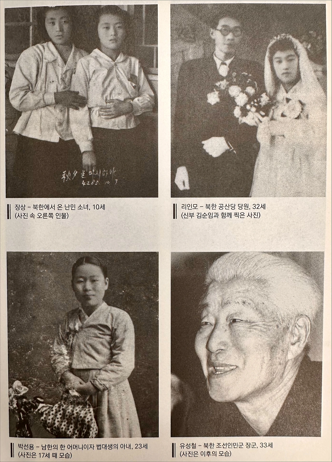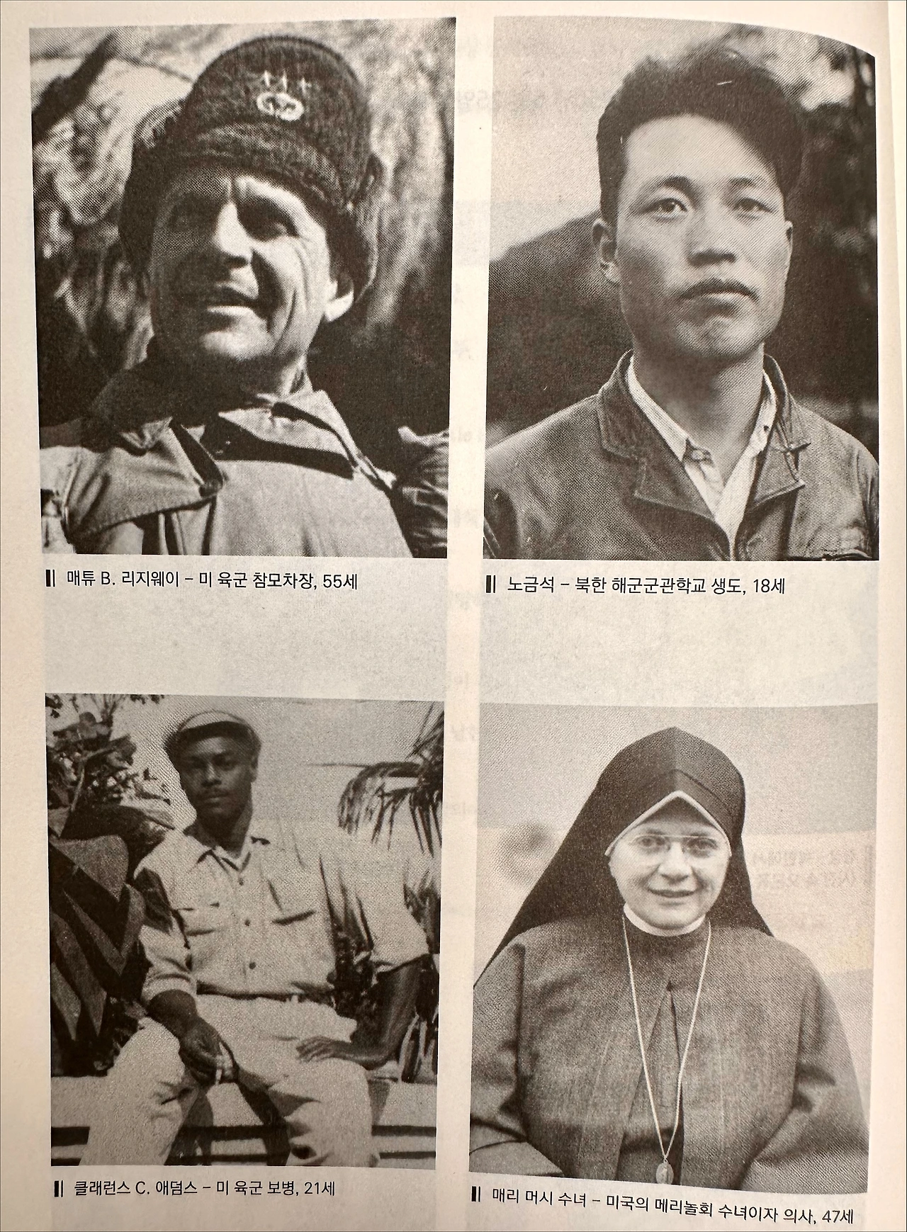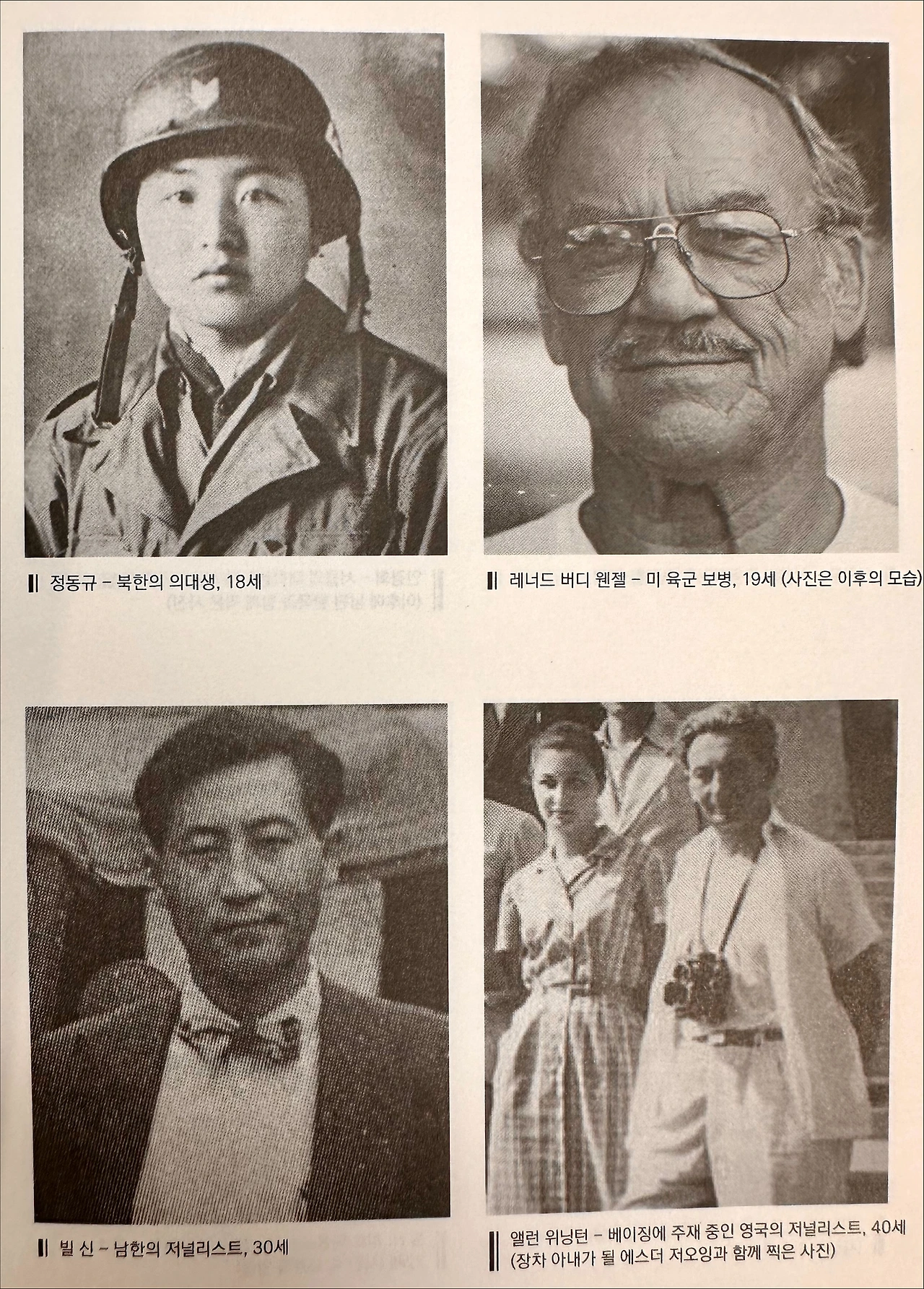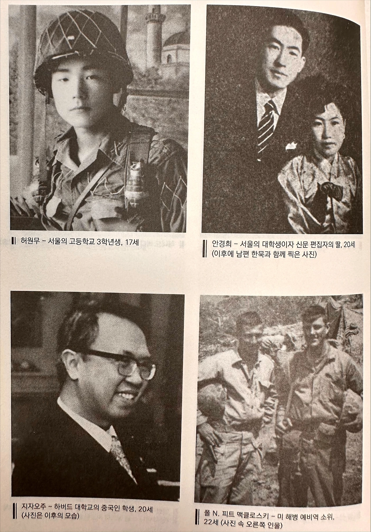 노근리 학살에서 두 아이를 잃은 생존자 박선용, 북에서 태어났지만 남으로 내려와 이리저리 피난을 다니던 10대 소녀 장상(추후 이화여대 총장이 된), 중국과 북한을 오가며 미그기로 수없이 많은 공중전을 거친 북한 공군 조종사 노금석(정전 후 1953년에 미그기를 몰고 남한으로 귀순), 노근리 학살에서 무고한 양민들에게 방아쇠를 당기고 그 트라우마로 고통받는 미군 장병 버디 웬젤, 북한 고위 군사 지도자 유성철(정전 후 얼마 안 돼 숙청), 중국 인민군 사령관 펑더화이(문화대혁명 중 숙청), 전투 중 포로로 억류되어 있다가 공산주의에 감화단 미군 흑인 장병 클래런스 애덤스, 치열한 고지전들을 거치며 영웅적인 활약을 통해 훈장을 받지만 한국전쟁에 회의를 품은 미군 장교 피트 맥클로스키, 지리산 빨치산으로 긴 시간 활동하다가 결국 사로잡혀 최장기 미전향 장기수가 된 북한 공산주의자 리인모, 하버드를 그만두고 조국을 위해 귀국하여 2년 동안 끌어온 정전 협의 막판에 투입되어 통번역을 맡은 엘리트 중국인 지자오주, 맥아더를 이어 한국전쟁을 지휘한 미군 사령관 매튜 리지웨이, 10대 후반의 의사를 꿈꾸는 소년이었으나 전쟁을 거치며 어른이 된 국군 위생병 정동규, 의학박사임에도 종교적 사명으로 피난민이 1백만 명 넘게 몰린 부산의 열악한 의료환경을 개선하려 애쓴 수녀 메리 머시(부산 메리놀 병원의 초대 원장) 등의 이야기가 교차되며 3년 4주 4일간의 치열한 한국전쟁을 풍성하게 그려냈다.