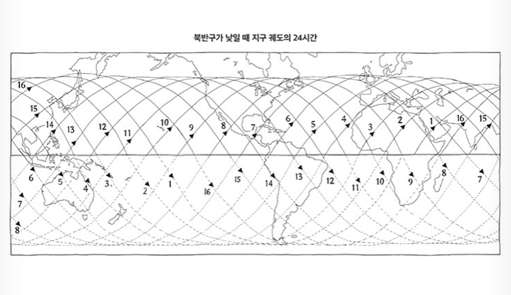 지구를 이렇게 빠르게 지나치다 보면 가끔 지치고 어리둥절해질 때가 있다. 대륙 하나를 지나친 지 15분도 되지 않아 다음 대륙을 통과한다. 사라져 버린 대륙을 떨쳐 내기 힘들 때도 있다. 왔다가 떠나간 대륙에서 일어나는 모든 삶이, 그 감각이 가시지 않고 남는다. 대륙들이 열차 창밖의 벌판과 마을처럼 휙휙 지나간다. 낮과 밤, 계절과 별, 민주주의와 독재. 멈추지 않는 트레드밀에서 자유로워지는 순간은 밤에 잠잘 때가 유일하다. 그러나 잠잘 때조차 옆에 누워 있는 사람의 인기척을 느끼듯 지구의 회전을 느낄 수 있다. 거기 있음을 느낀다. 일곱 시간의 밤을 뚫고 나오는 낮을 빠짐없이 느낀다. 활기찬 별들과 바다의 기운과 비틀대는 빛을 피부로 느낀다. 만일 지구가 1초라도 자기 궤도에서 멈춘다면 무언가 잘못되었음을 직감하고 화들짝 놀라 일어날 것이다.