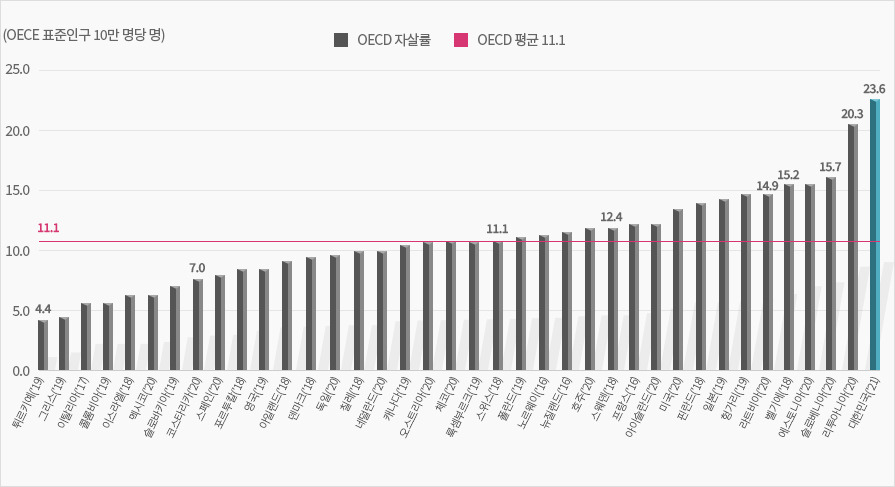 OECD 자살률 1위를 20년째 놓치지 않고 있는 대한민국의 현실 (실제 질병관리청은 '우리나라의 자살률은 OECD 국가 중 1위이며, OECD 국가 평균(11.1명)의 2배 수준으로 2004년 이래 줄곧 1위를 차지하고 있습니다.'라고 아래 표를 설명한다.)에 어떤 시사점을 줄 수 있을까 해서 골라온 책인데, 묘하게 이질감이 느껴진다.
