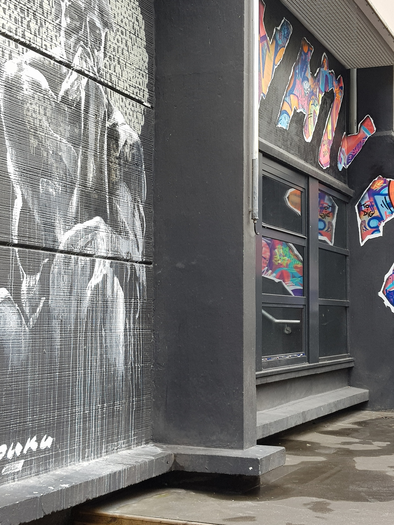 1층에서 계단을 따라 올라가자, 벽에는 그래피티가 가득했다.