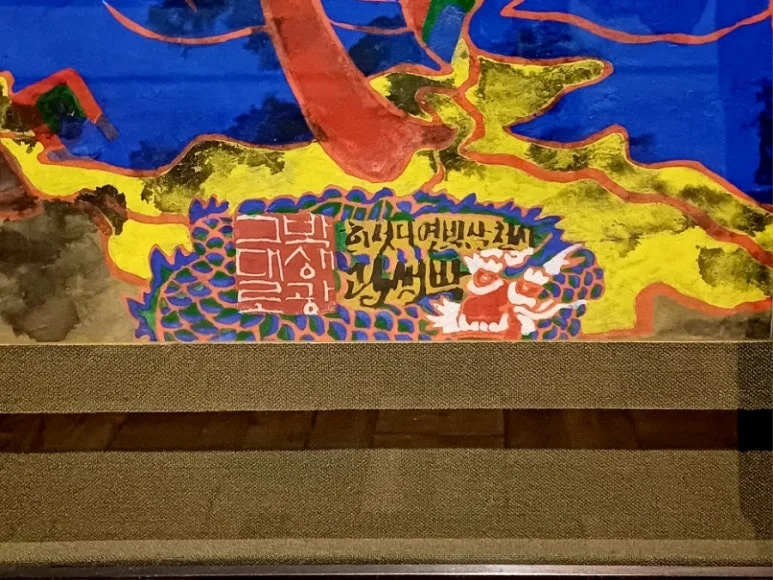 늘 확인하는 그의 낙관 '그대로 박생광 사천삼백열다섯해'에서 우리의 것을 열렬히 지키려 한 그의 마음을 느낄 수 있어요. 말년에 후두암에 걸려 8년 동안 두문불출하며 민족주의적 성향의 그림을 그린 그는 늘 '단기'를 쓰고 '년'이 아닌 '해'를 써 날짜를 표시했고 이를 그림에서 확인할 수 있어요.ᐟ