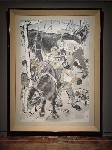 이종상은 소에 안장을 채우는 일꾼들이 움직이는 모습을 담았어요. 그들은 자신이 담당한 일에만 몰두할 뿐 서로 마주 보거나 다른 곳에 시선을 두지 않죠.