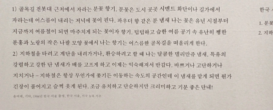 제가 서울에 혼자 살기 시작하면서 자리 잡은 동네엔 홍제천이 흐릅니다. 그 옆은 불광천이 있고요. 어느 작가의 불광천을 산책한 기록이 담긴 '천변 산책'이란 책이 떠오르는 향이 기억이네요.