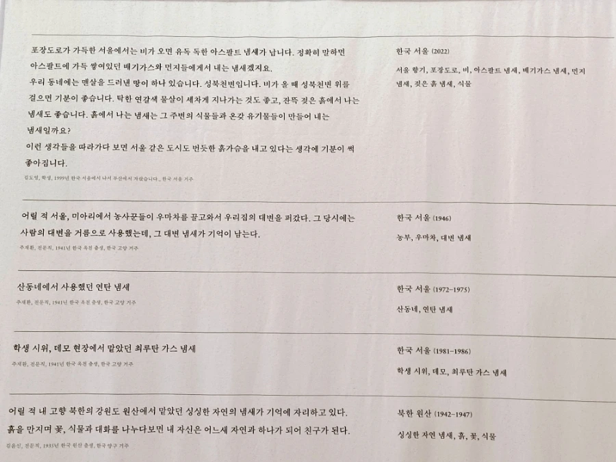 외국인은 광주비엔날레와 관련된 사람과 한예종 같은 예술과 교환학생의 김치, 떡볶이와 관련된 사연이 많았어요. 냉장고에 김치 없이 사는 한국인도 많은데 여전히 김치랑 떡볶이는 외국인에게도 강렬한 기억으로 남는 음식인가 봅니다. 그리고 부산 등 바닷가 근처에 살았던 사람들이 기억하는 바다의 짠내, 서울에 처음 올라왔을 때 위로가 된 향을 담은 기억이 많더라고요.