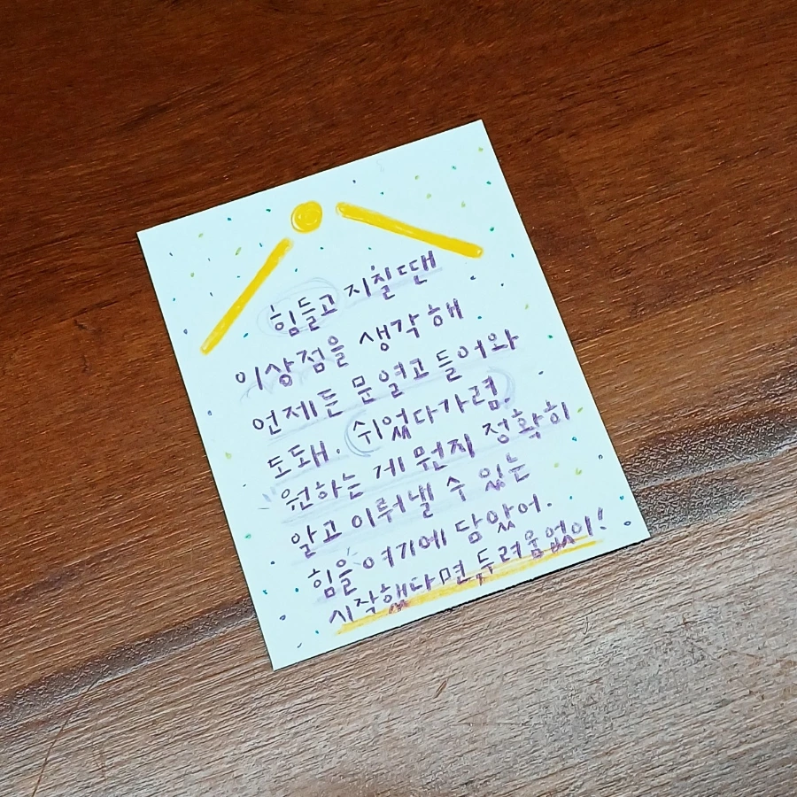 얼마 전 동료들과 '덕담을 쓰고, 누가 쓴 글인지 모르게 나눠갖는 시간'을 가졌다. 누군가의 마음이 담겨있는 덕담카드는 샛노랗고 빨간 노른자 같은 해가 마음속으로 쏘옥 들어오는 것과 비슷한 효과를 냈다.