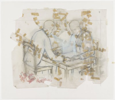 트레이싱지에 그려진 인물 드로잉이 눈에 띈다. 한 겹으로 이루어진 드로잉이 아니라 테이프로 러프하게 겹쳐 붙인 흔적도 궁금증을 불러일으킨다.