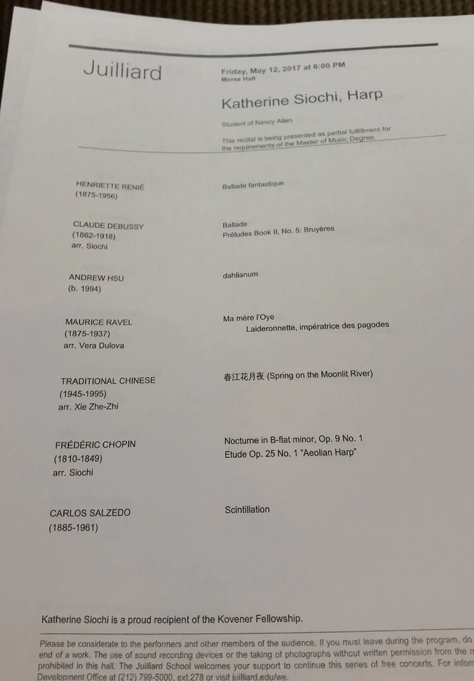 학교에서 학생들이 하는 공연이지만(리사이틀이라고 생각하면 된다) 그래도 마냥 캐주얼하지만은 않은 공연이다. 관객들 모두 매너 있게 행동했고 연주자들도 아직은 학생이지만 의상도 포멀 하게 입고 연주에 진지하게 임하고 그리고 무엇보다 예상했던 것보다 실력이 훨씬 좋았다.
