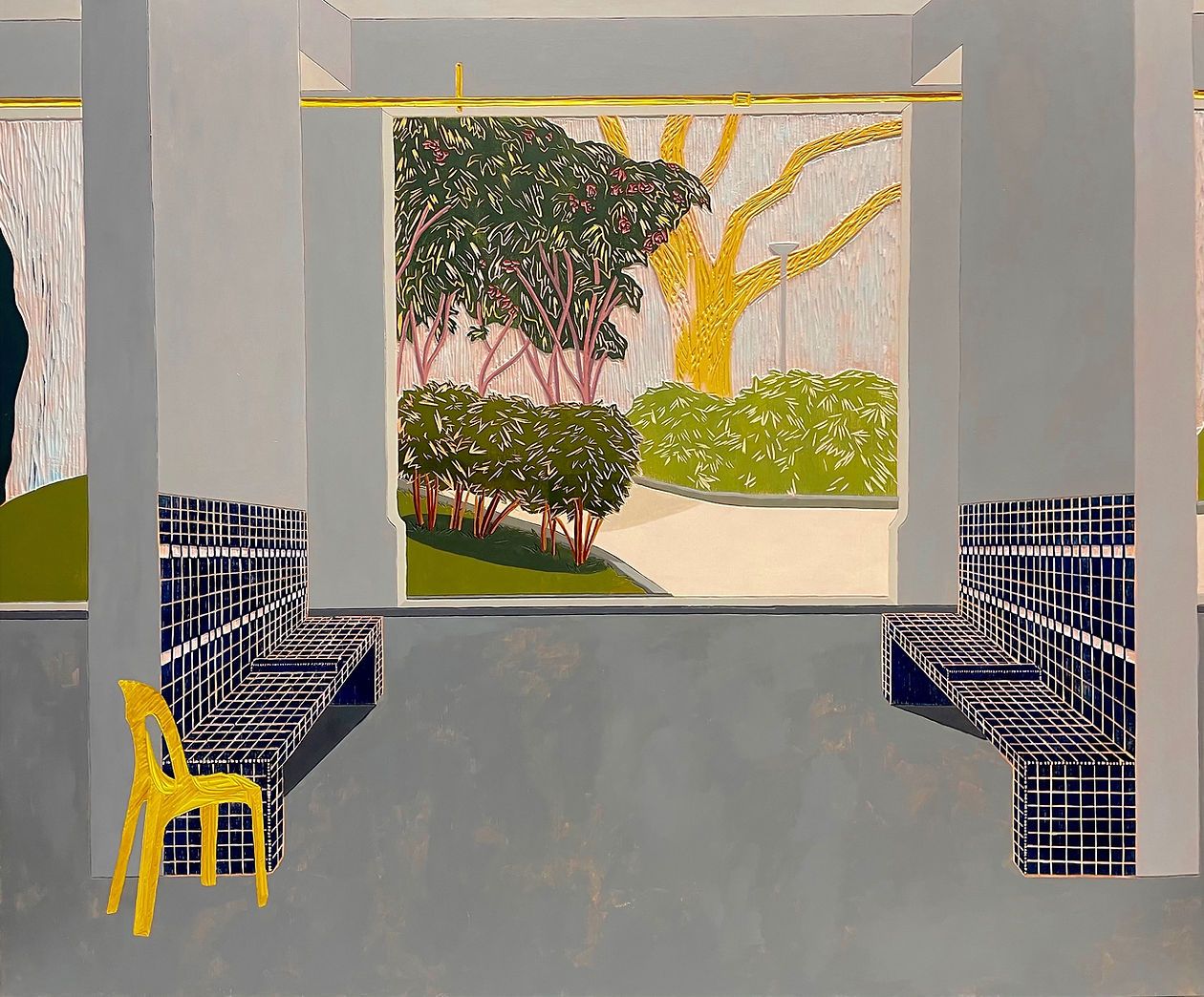 위 In A Tree, a Roof and a Pond (2021) 작품에서는 주거단지에있는 다목적공간이 등장한다.