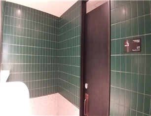 마스크 착용 문구(좌) 스타벅스 화장실의 녹색 타일(우)