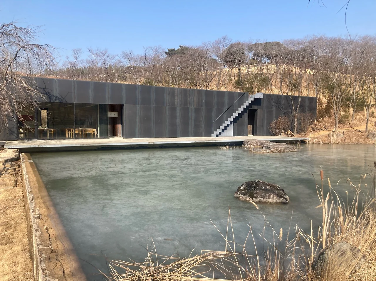 '사담'은 현재 예약제 레스토랑으로 운영되고 있습니다. 점심, 저녁을 즐길 수 있으며 해가 빨리 떨어지는 겨울의 저녁 식사 후에는 마치 수많은 눈이 지켜보고 있는 듯한 칠흑 같은 산길을 내려오는 것 또한 독특한 경험입니다. 사유원을 일반에게 공개하기로 결정했을 때 설립자는 공간행동연구가들을 불러 사유원의 10만여 평의 공간 안에 몇 명이 있을 때 방문하는 각각의 사람들이 온전히 혼자 있다고 느낄 수 있는지를 물었고 그렇게 해서 나온 것이 하루 300명의 인원 제한이라고 합니다. 그렇게 온전히 혼자 있다고 느끼는 숲 속에서도, 이 겨울 저녁은 무엇보다도 혼자 있다고 느낄 수 있는 시간이 아닐까 싶습니다. 사담의 앞으로는 연못과, 그 연못 건너편으로는 공연을 할 수 있는 넓은 벤치이자 데크가 깔려 있습니다.