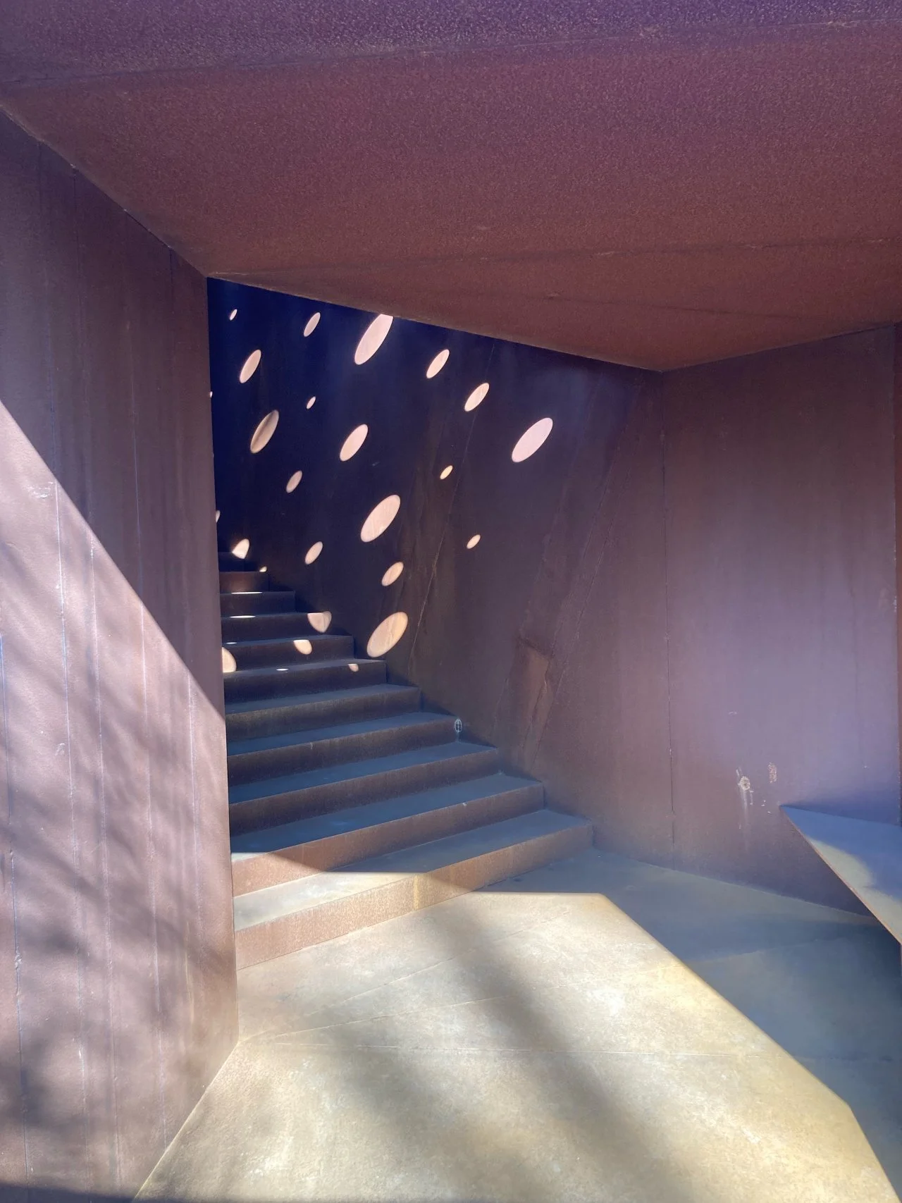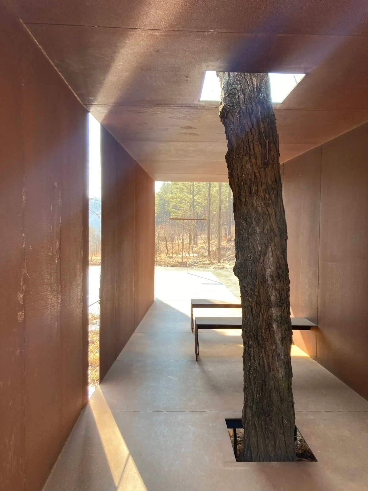 역시 2019년에 지어진 '와사'는 깨달음을 얻는 연못이라는 뜻의 '오당'의 낙차를 따라 마치 물길이 흐르듯 붉은 철판으로 지어진 건물입니다. 지형을 따라 계단을 올라가기도, 내려가기도 하며 실내라 할 수도 실외라 할 수도 없는 공간의 곳곳은 다양한 빛들로 채워져 있습니다. 명상의 수도원이 물길을 따라 누웠다고 하여 와사라 이름 지었다고 합니다.