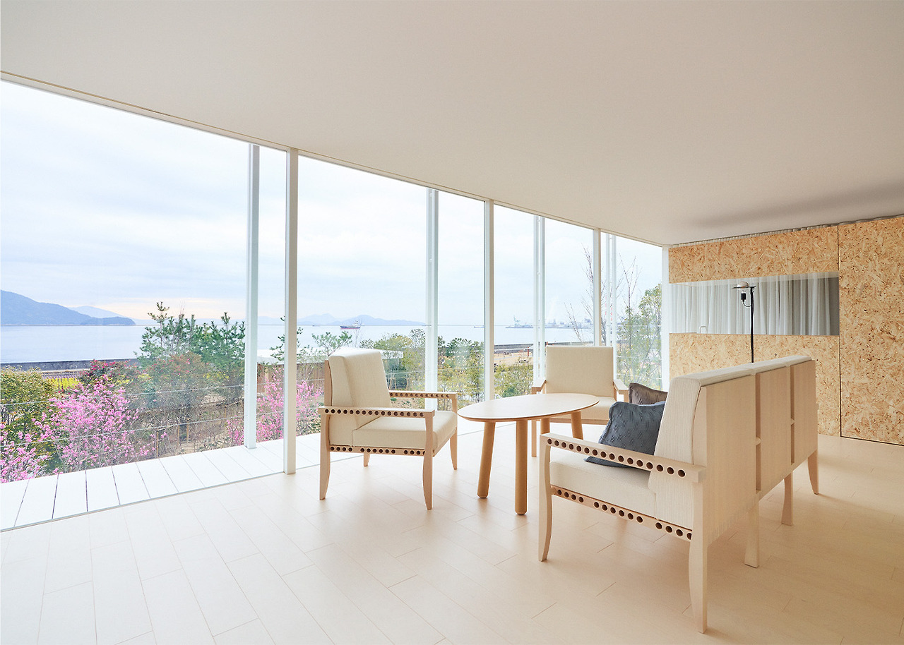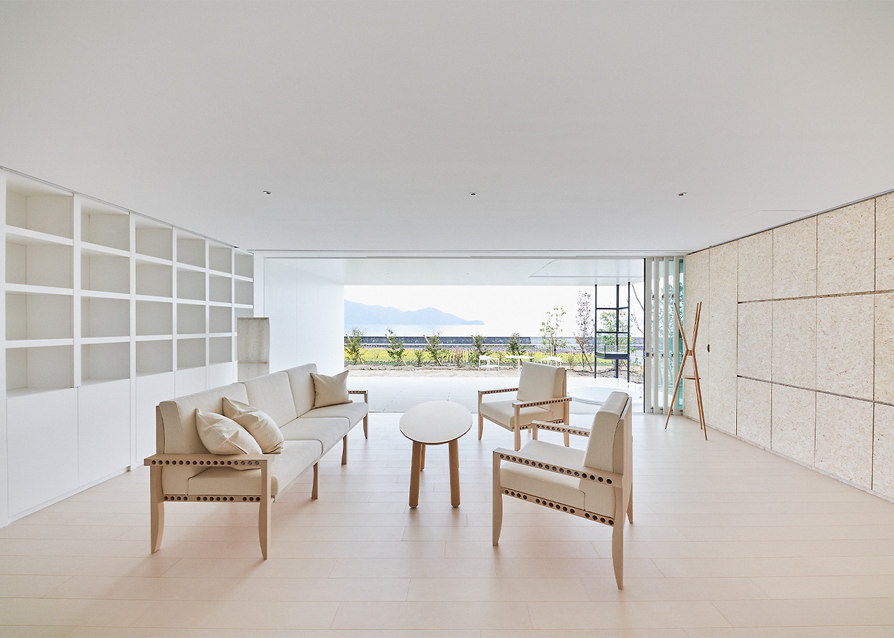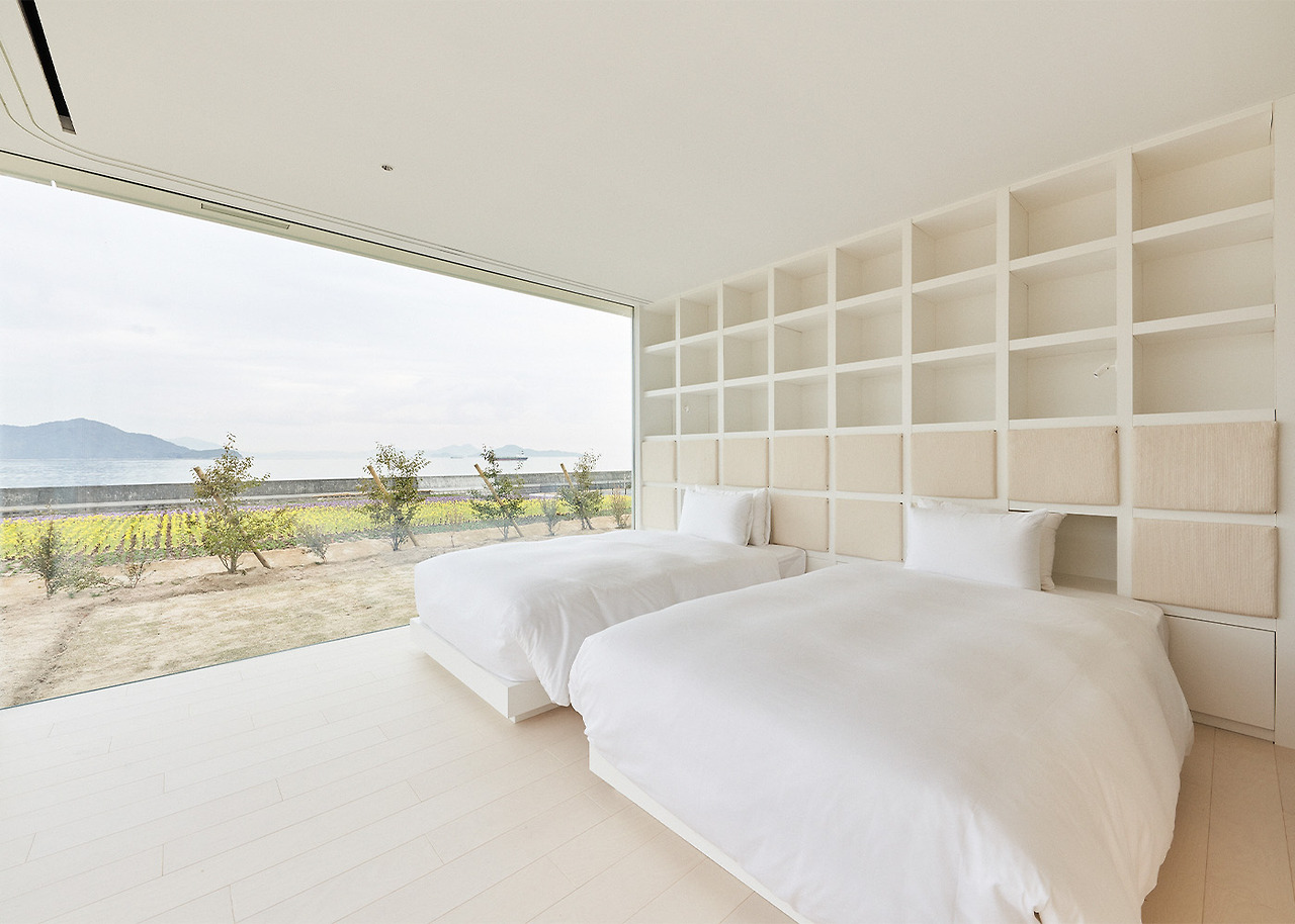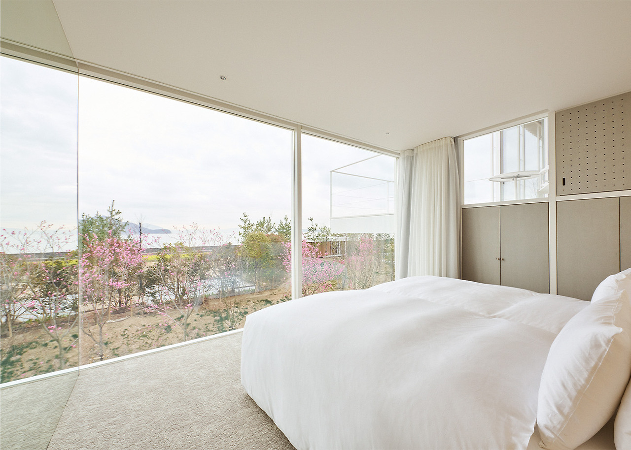 Simose Art Garden Villa를 위해 새롭게 디자인된 이 빌라는 두 개의 교차하는 벽으로 형성된 십자가를 중심으로 하며, 이 벽은 주요 구조 역할을 하며 땅 위로 떠 있는 생활 공간을 지원합니다. 최상층의 거실 스타일 욕실 공간에는 히노키 욕조와 세토 내해를 바라보는 데이베드가 있습니다.