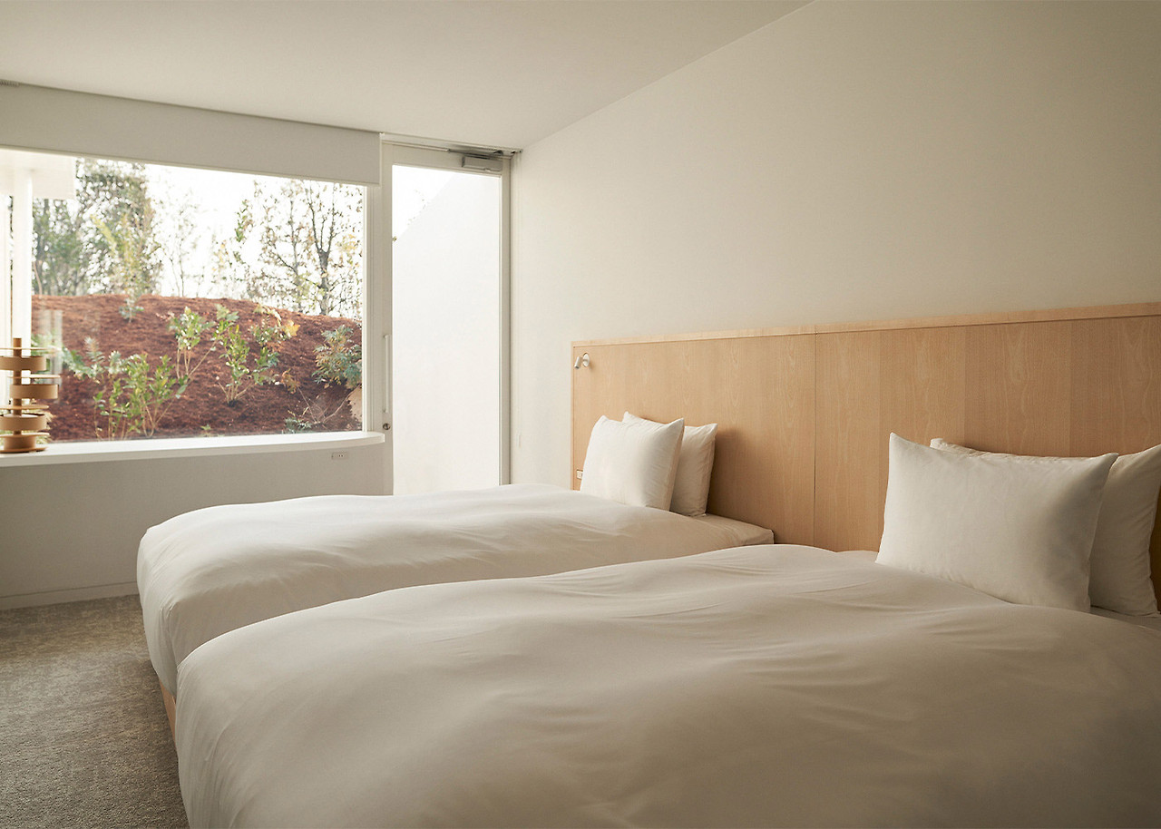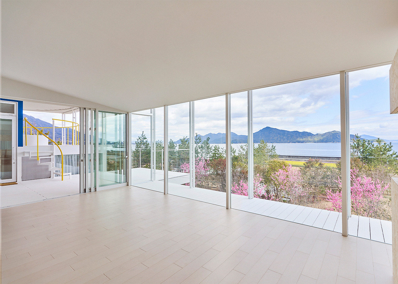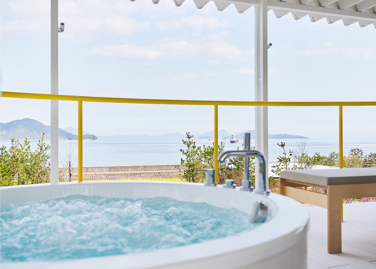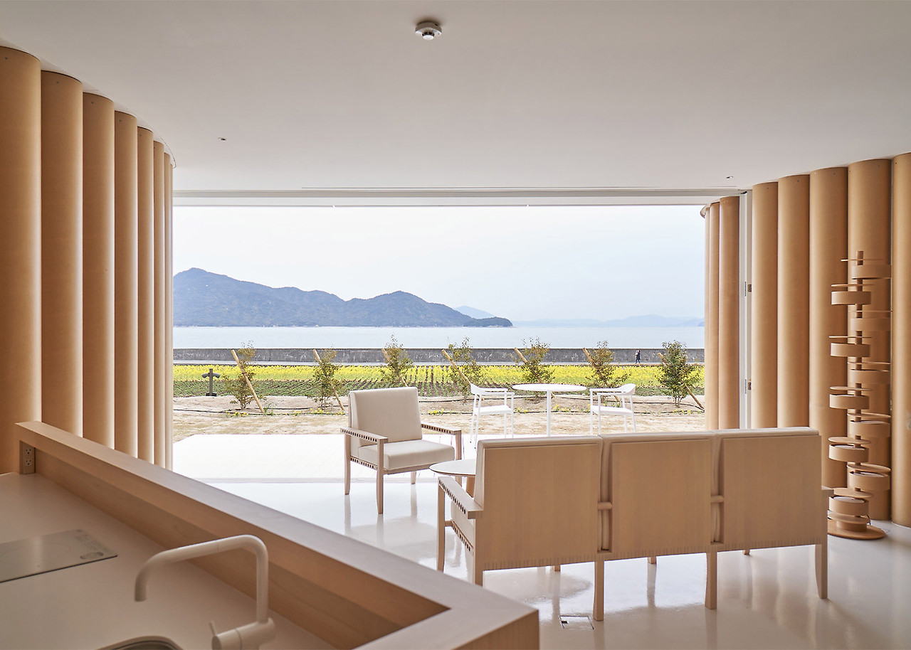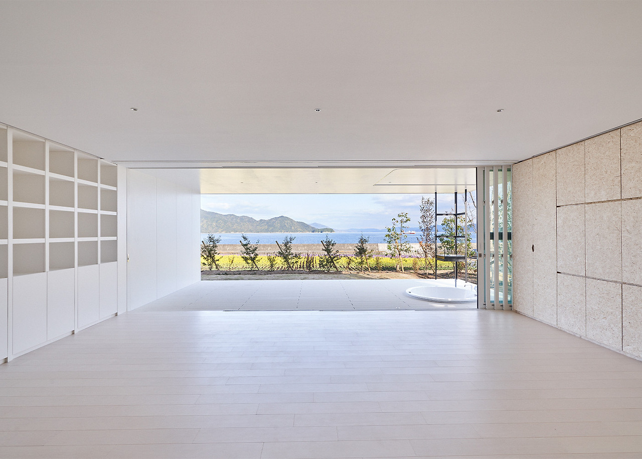 Simose Art Garden Villa를 위해 새롭게 디자인된 이 빌라는 두 개의 교차하는 벽으로 형성된 십자가를 중심으로 하며, 이 벽은 주요 구조 역할을 하며 땅 위로 떠 있는 생활 공간을 지원합니다. 최상층의 거실 스타일 욕실 공간에는 히노키 욕조와 세토 내해를 바라보는 데이베드가 있습니다.