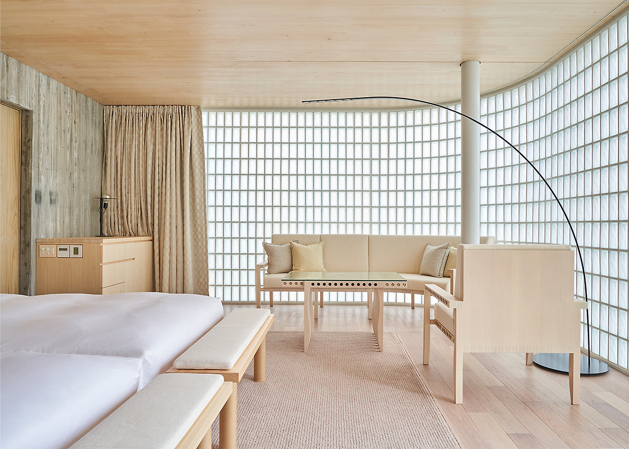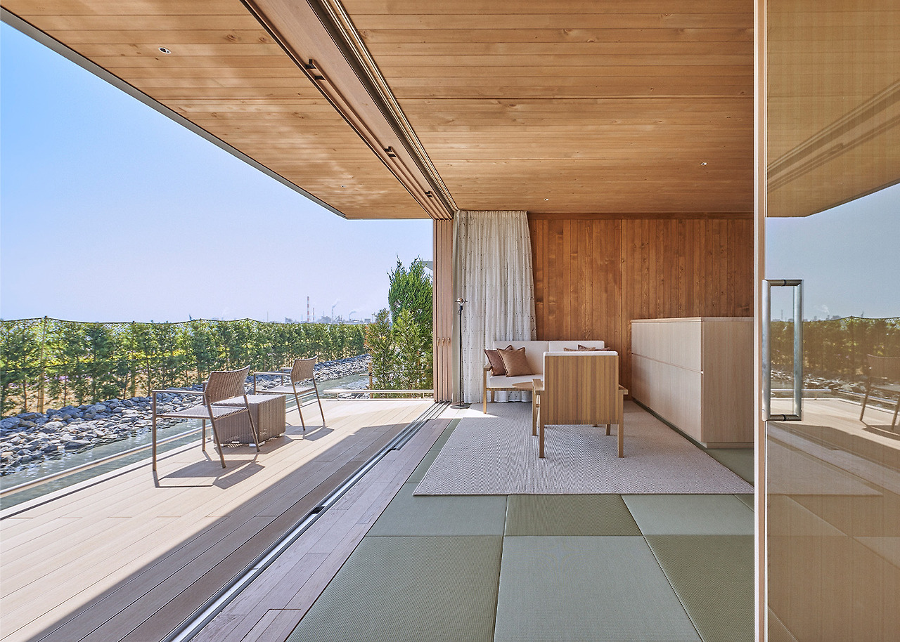 이 빌라의 벽과 지붕 전체에 독특한 단면을 가진 오스트리아 건축 자재인 킬슈테그가 사용되었으며, 공간에 들어오는 빛을 걸러냅니다. 이 빌라의 분할되지 않은 공간은 슬라이딩 도어와 다다미 매트가 있는 일본 스타일로 꾸며져 있으며, 바다를 바라보는 거실과 일본 사이프러스로 만든 실내 욕실이 특징입니다. 수로를 접하고 있는 이 다섯개의 빌라는 각각 조금씩 다른 디테일을 가지고 있습니다.