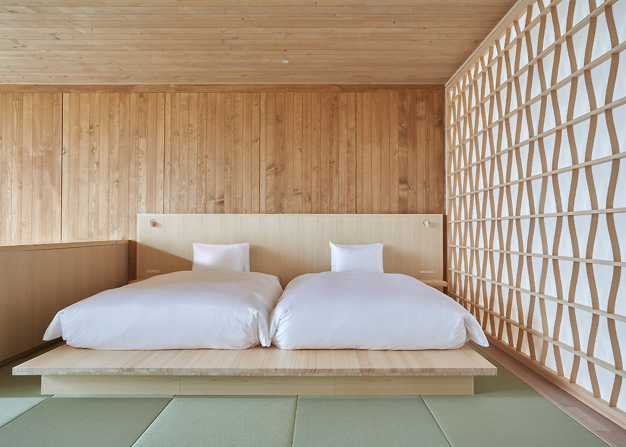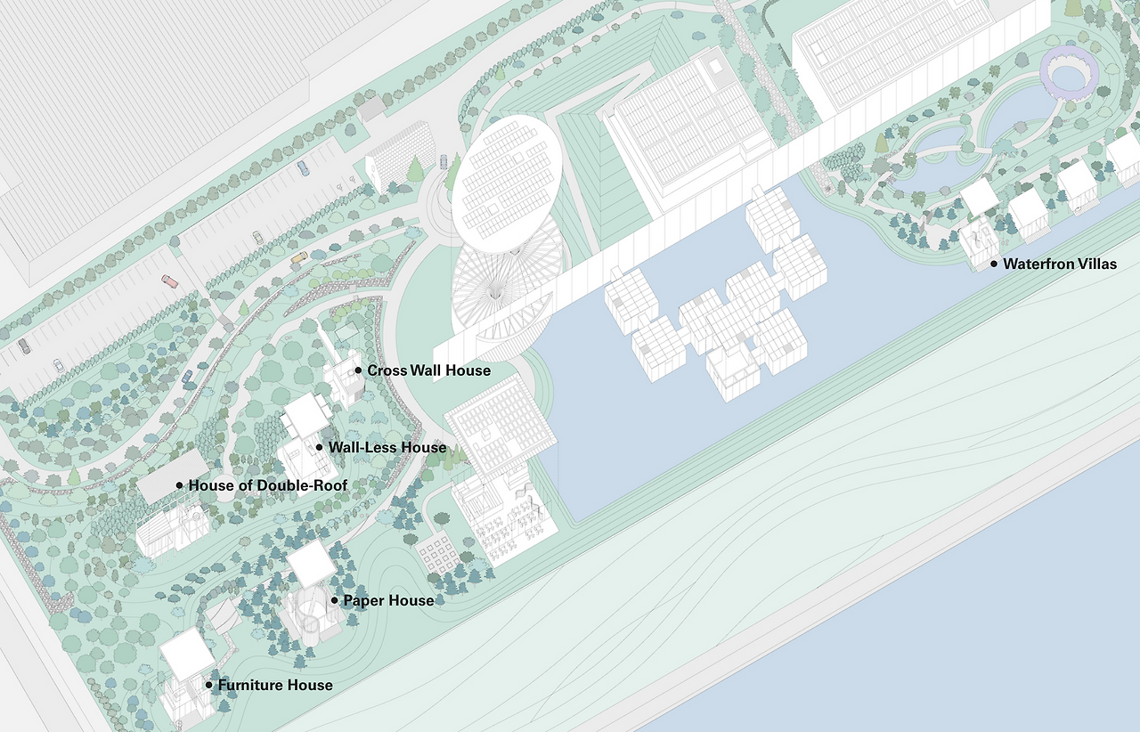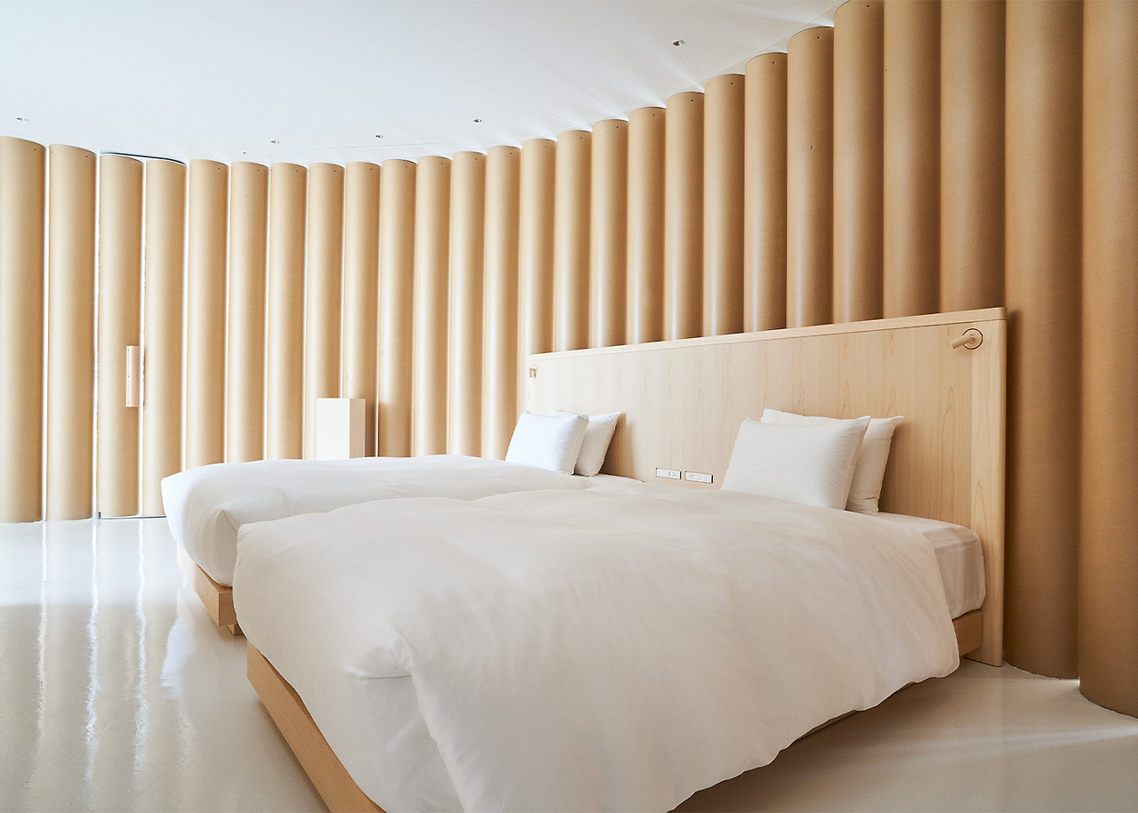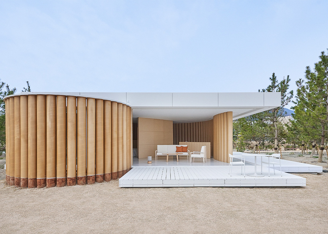 이 빌라는 반 시게루의 시그니처 재활용 종이 튜브를 주요 구조로 사용하며, 1995년 야마나카 호수에 지어진 빌라를 재현한 것입니다. 110개의 종이 튜브로 이루어진 리드미컬한 S자형 배열은 기둥 사이의 틈새로 빛이 쏟아지는 통풍이 잘되는 공간을 구성합니다. 종이 튜브의 S자형은 또한 노천탕을 감싸고 있습니다.