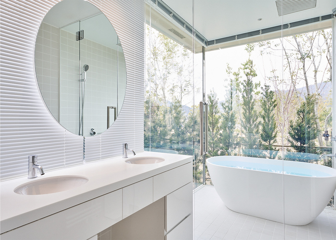 이 빌라는 1997년 가루이자와에 지어진 휴가용 주택을 재현한 것으로, 3면이 슬라이딩 유리문으로 둘러싸인 독특한 공간을 중심으로 합니다. 투명하고 매우 개방적인 공간은 자연 환경과 어우러집니다. 소파와 욕실에서 나무, 바다, 하늘 사이를 떠다니는 느낌을 즐겨보세요.
