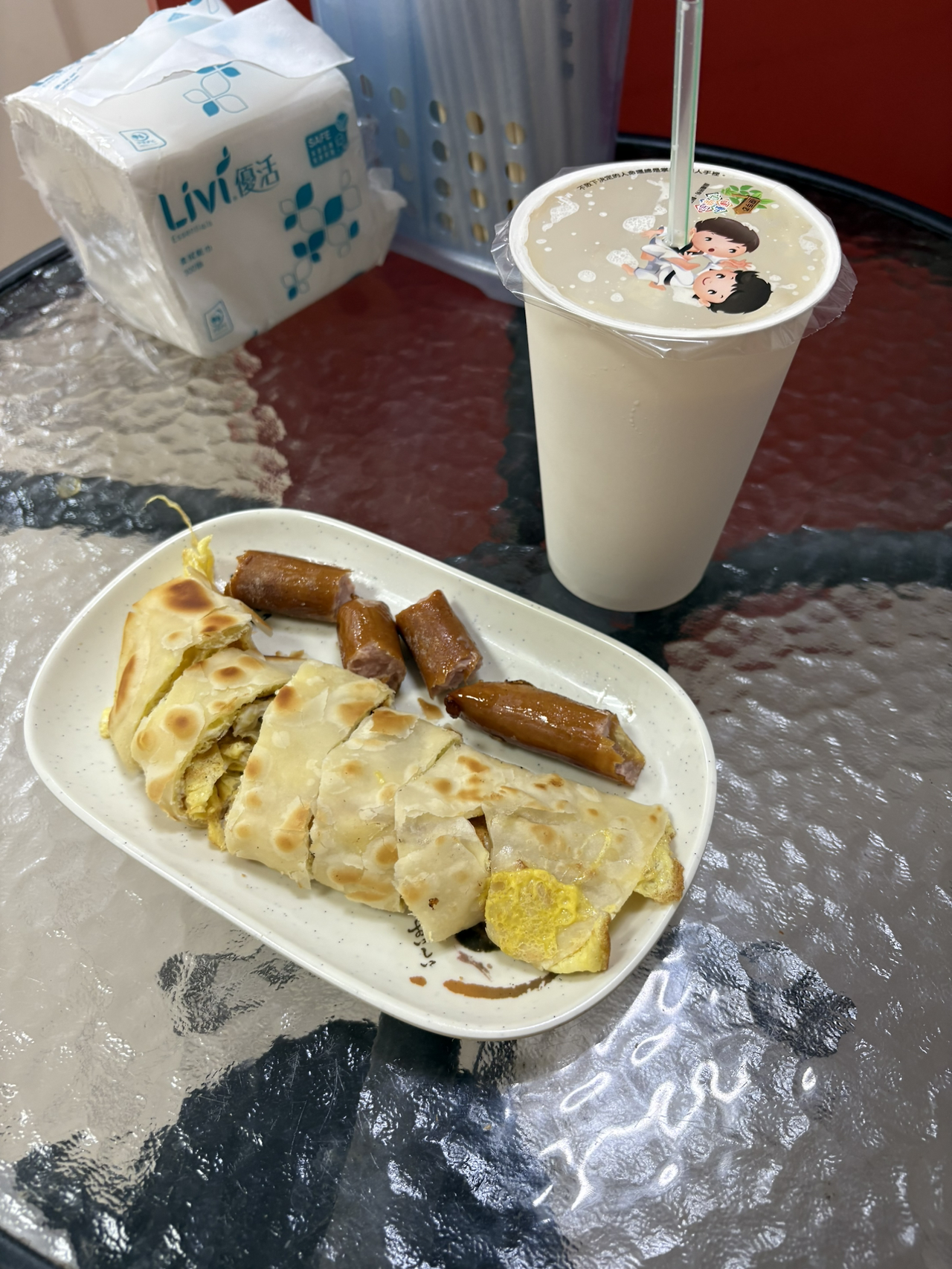 그래도 몇 번 다닌 짬밥으로 시킨 것. 밀전병 같은 것에 계란을 같이 부쳐주는 딴빙. 여기에 여러 야채나 고기같은 것을 추가하기도 하는데 나는 가장 기본적인 것을 시켰고 독일식 소시지를 추가로 시켰다. 옆에 음료는 또우장이라 부르는 두유. 따뜻하게도 차갑게도 먹을