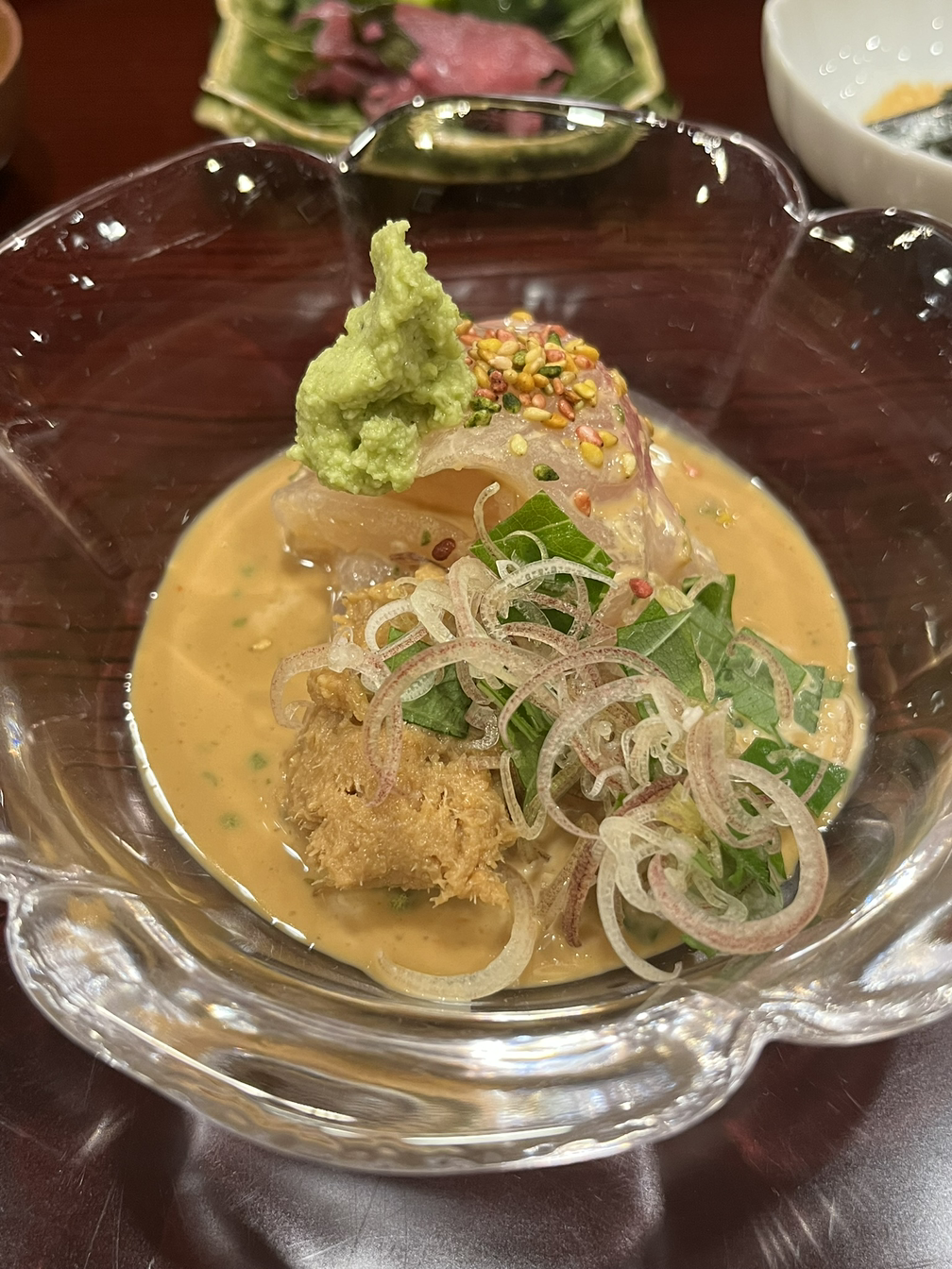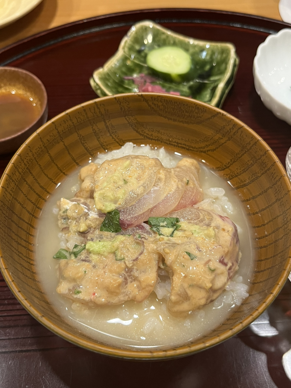 된장과 시소, 와사비, 양하와 깨 등등으로 양념이 되어 있는 도미는 밥이 나오기 전에 따로 맛을 보고, 밥이 나오면 오차즈케를 해 먹으면 된다.