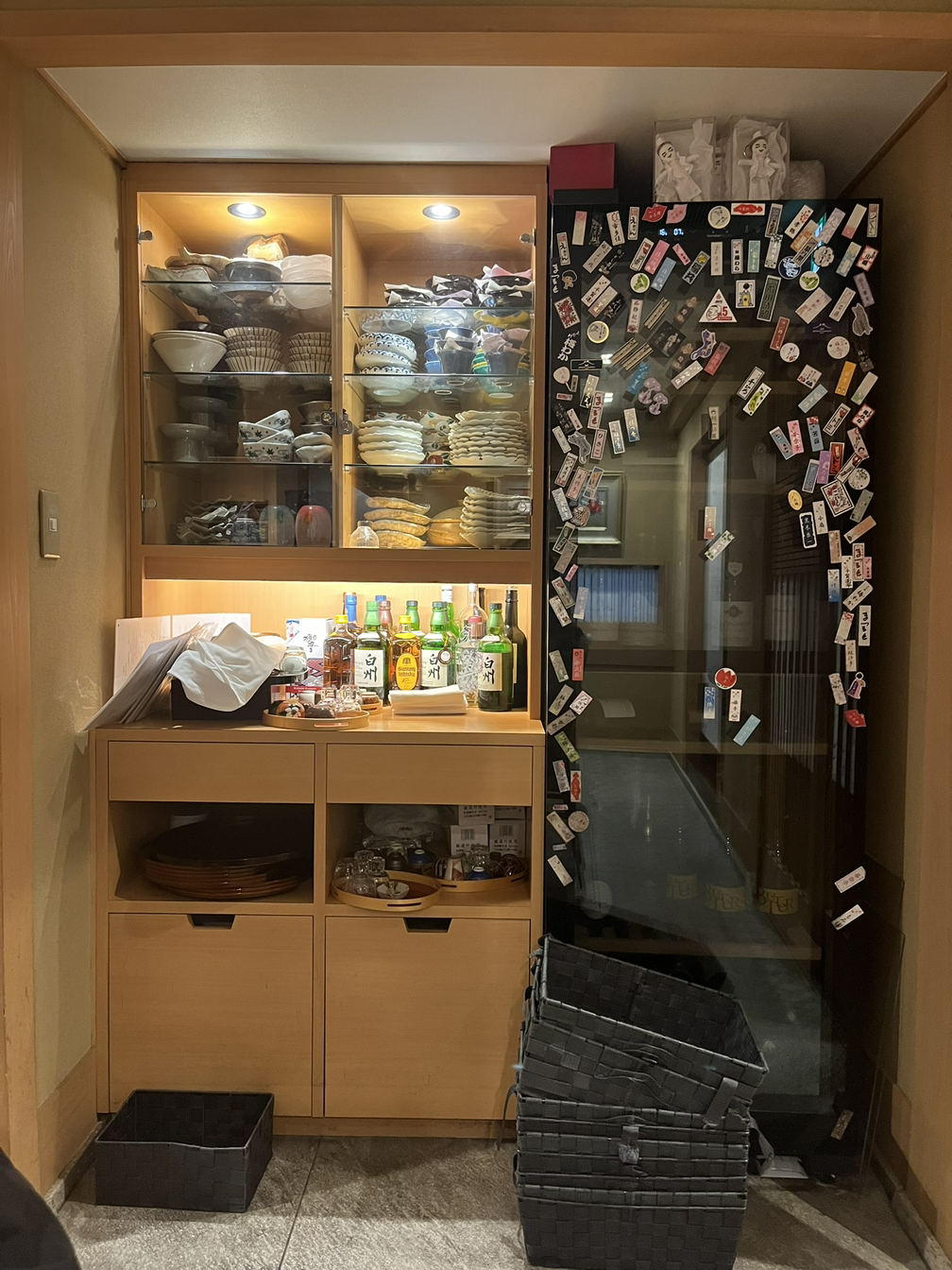 와인 냉장고에 붙은 스티커는 게이샤의 명함들이다. 요즘 게이샤들은 저렇게 귀여운 스티커 명함을 만드는데, 자기가 자주 가는 집에 저렇게 스티커를 붙여놓는다고 한다. 여기가 교토 기온이니, 말하자면 기온의 인플루언서 인증 맛집인 셈이다.