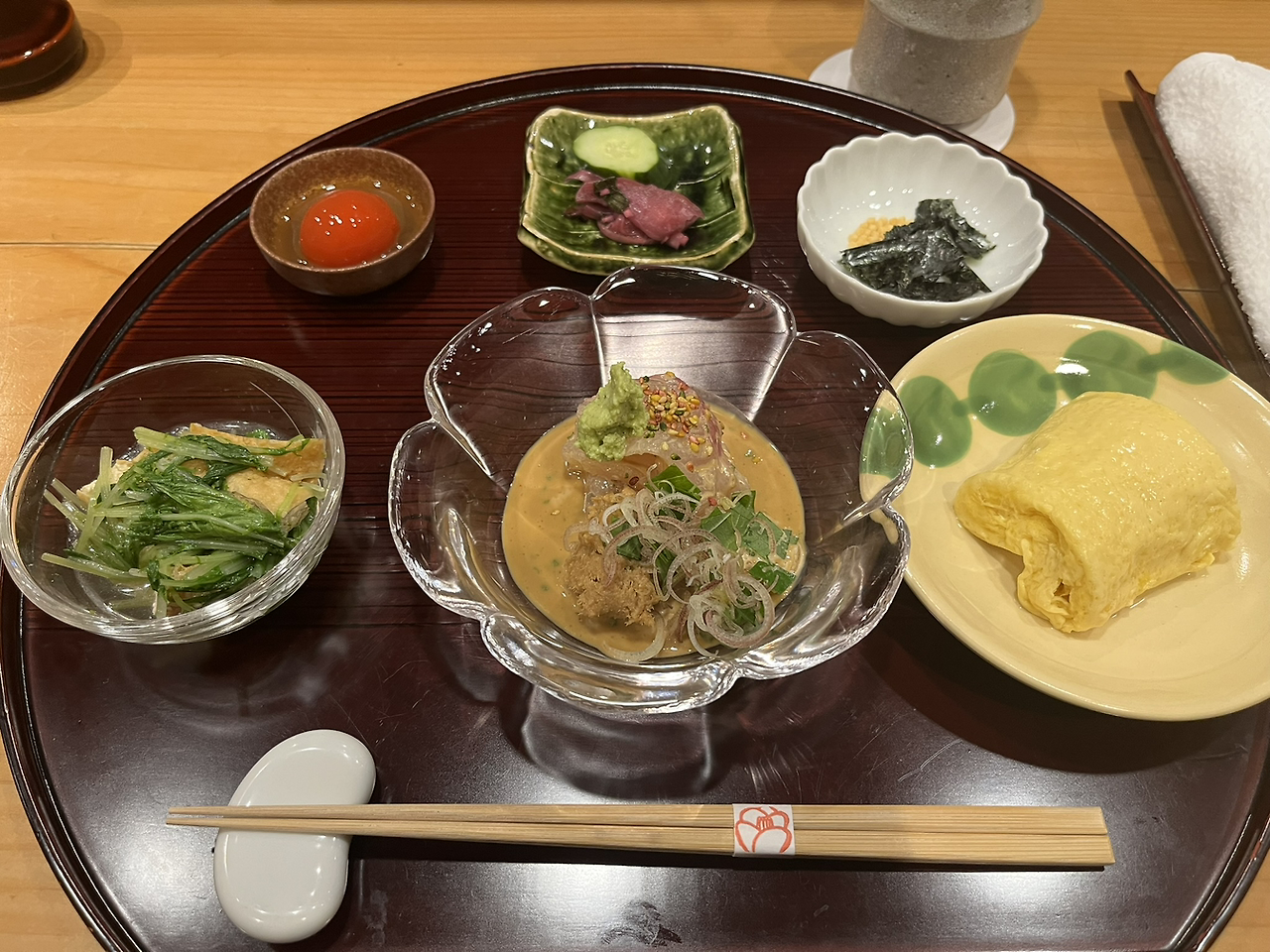 이것이 그날의 한 상. 얇은 겹이 겹겹이 있는 계란말이와 여러 반찬. 왼쪽 위는 생계란 노른자이고 오른쪽 위는 오차즈케에 취향껏 넣을 김과 아라레. 상의 가운데가 오늘의 메인, 도미이다.