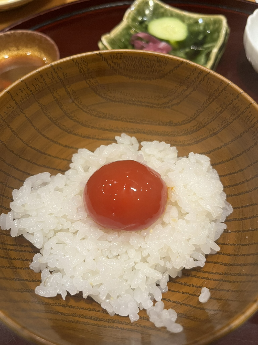 계란말이와 도미를 맛보는 동안 밥이 다 지어져서 첫 밥은 이렇게 계란 노른자와 먹었다. 비릴 것 같지만 일본은 생계란을 많이 먹어서 생식용으로 계란 생산을 관리해서 그런지 비린 맛은 없다. 아는 맛이지만 설명하긴 힘든데, 왠지 일본 사람들이 해외에 오래 있으면 이 맛이 생각날 것 같다는 생각이 드는 맛이다. 한국 사람이 김치 생각이 나는 것처럼 말이다.