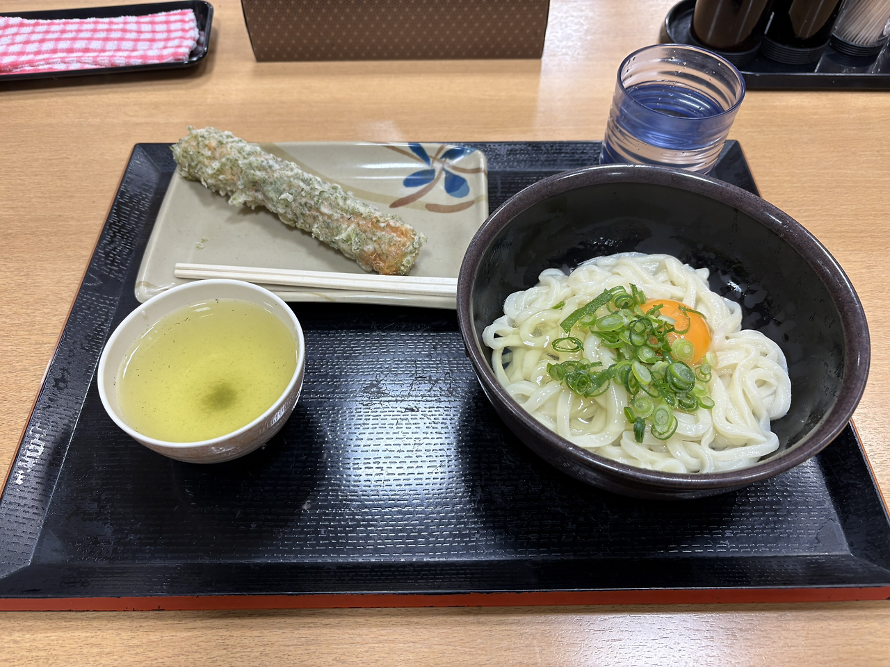 국물이 있는 우동과 고민하다 결국은 비빔 우동을 선택했다. 신선한 날계란은 일본이 아니면 먹기 어렵기도 하고 탱글탱글한 우동 면발을 느끼고 싶었기 때문이다. 왼쪽 위는 치쿠와 튀김이다.