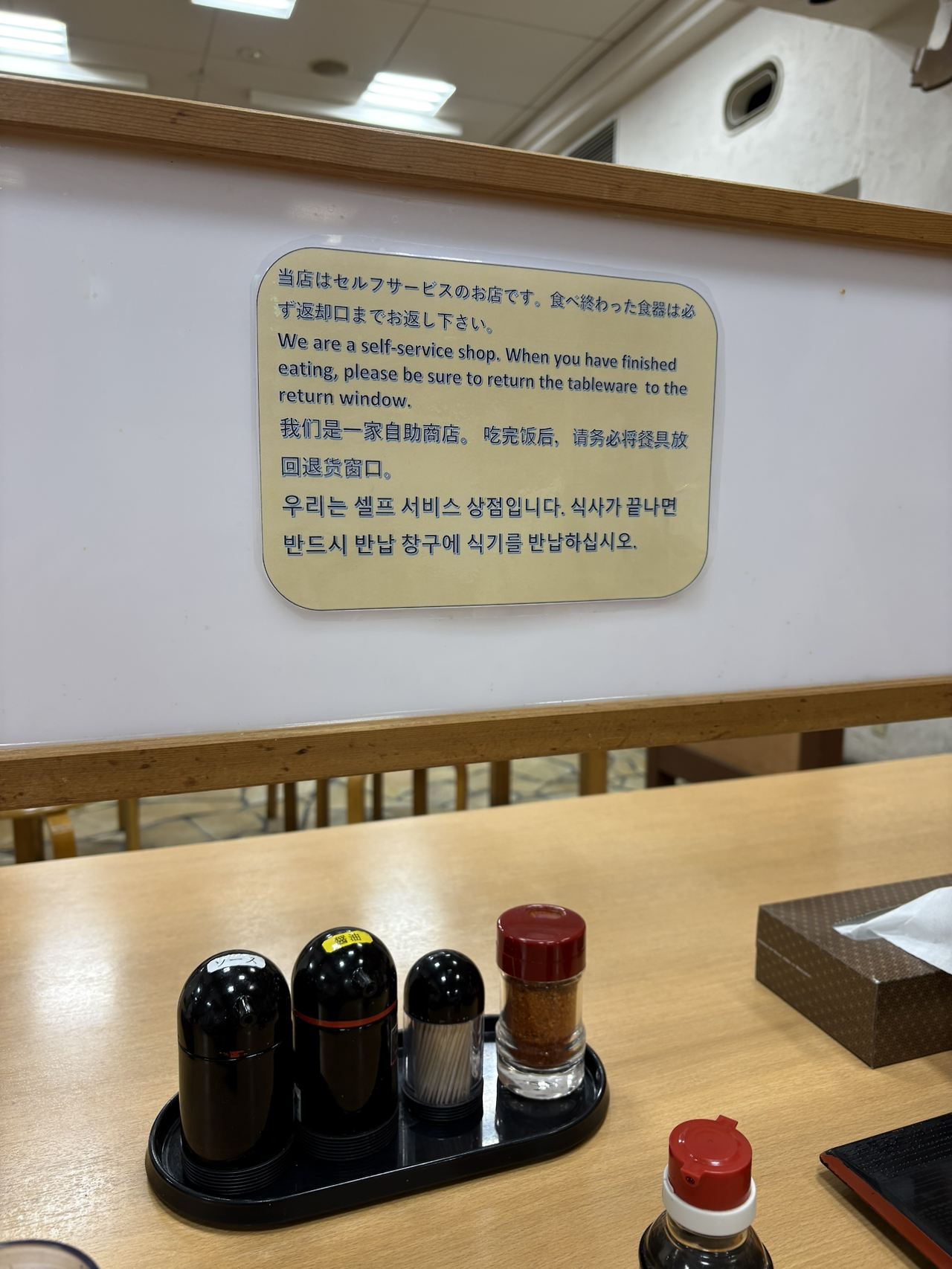 혼자 먹는 사람들이 대부분인지 내부에는 이런 모양의 테이블이 대부분이었다. 저~~ 안쪽에 보이는 주방에 가서 원하는 우동을 말하고 튀김이나 반찬 등을 골라 담고 계산하는 시스템이었다.