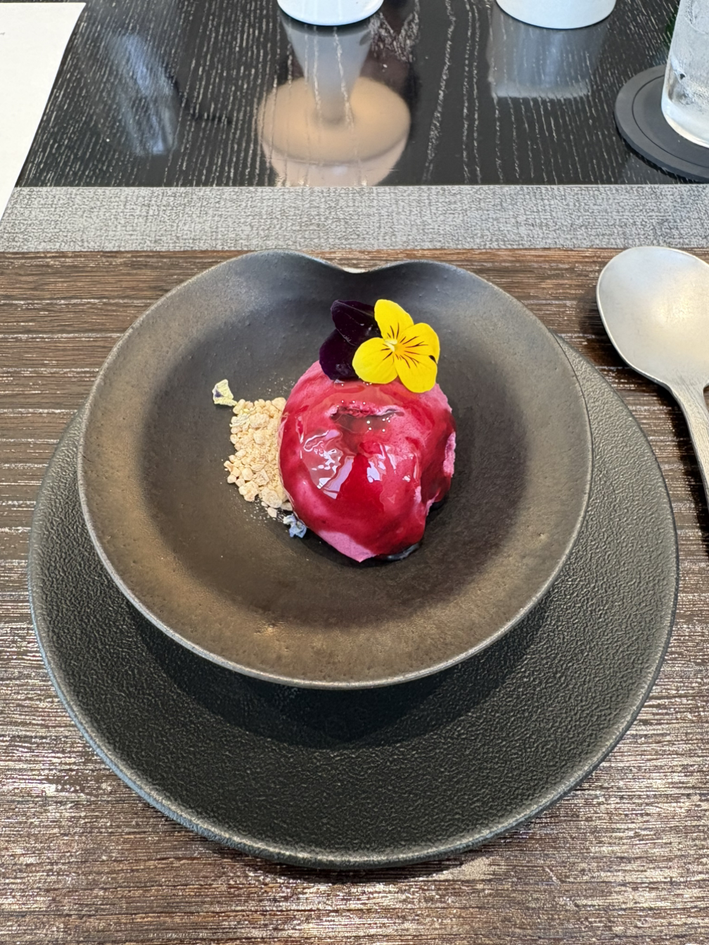 역시 직접 만든 아이스크림. 비트와 복분자를 넣고 만든 아이스크림인데 옆에 크럼블은 제피를 넣어 만든 것이다. 색 때문에 비트를 넣은 것 같은데 색은 깔끔하게 뽑으면서도 비트 특유의 향은 느껴지지 않았고 잡스러운 맛이 없는 깔끔한 복분자의 맛에 제피가 주는 악센트가 놀라웠다!