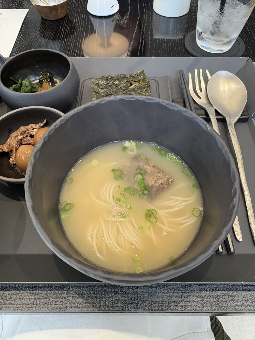 곰탕은 사태와 양지, 사골을 넣고 48시간을 고았다고 하는데 차이가 느껴질 만큼 진하고 안에 들어간 고기도 부드럽게 맛있었다. 곰탕은 사실 한국의 가정집이라면 겨울 내내 불에서 내려올 일이 없는 메뉴라 집집마다 자신 없어하는 집이 없을 텐데, 확실히 깊고 순수한 맛이 있어서 일반적인 곰탕과는 차이가 있었다. 모든 반찬에 간이 적당하고 맛있었지만 왼쪽 위에 있는 토하젓이 섬세했고, 사진에 잘 보이진 않지만 부산 지역에서 주로 먹는 제피 장아찌가 오랜만인데 역시 요리에 어울린다는 생각이 들었다.