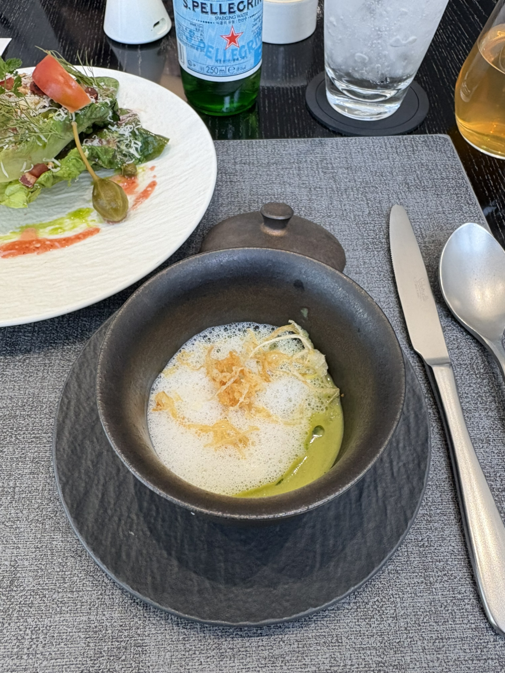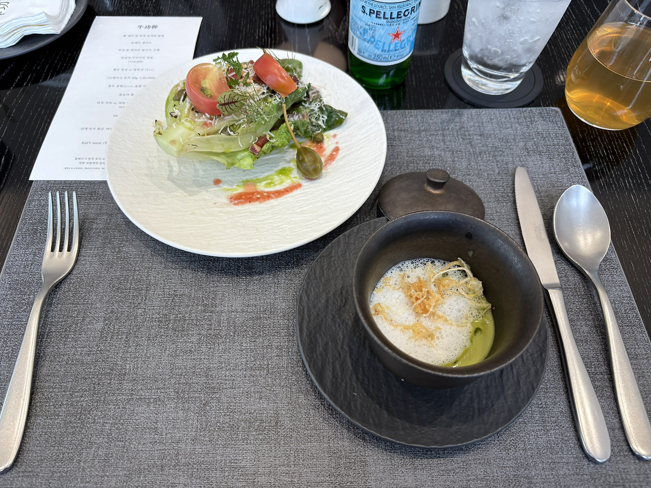 첫 번째 코스인 샐러드와 수프. 샐러드는 딸기가 들어간 소스였고 수프는 낙동강 하구 쪽에서 많이 잡히는 갈미 조개와 아스파라거스 등이 들어간 수프였다. 수프 위에는 치즈 거품과 달래 뿌리 튀김이었는데 나는 개인적으로 수프가 맛있었다. 갈미 조개가 신선하고 튀긴 달래 뿌리가 독특하면서도 향이 있어 좋았다. 샐러드에서는 큰 감흥이 없었는데 딸기가 들어간 소스가 좀 달다고 느껴서인 것 같다.