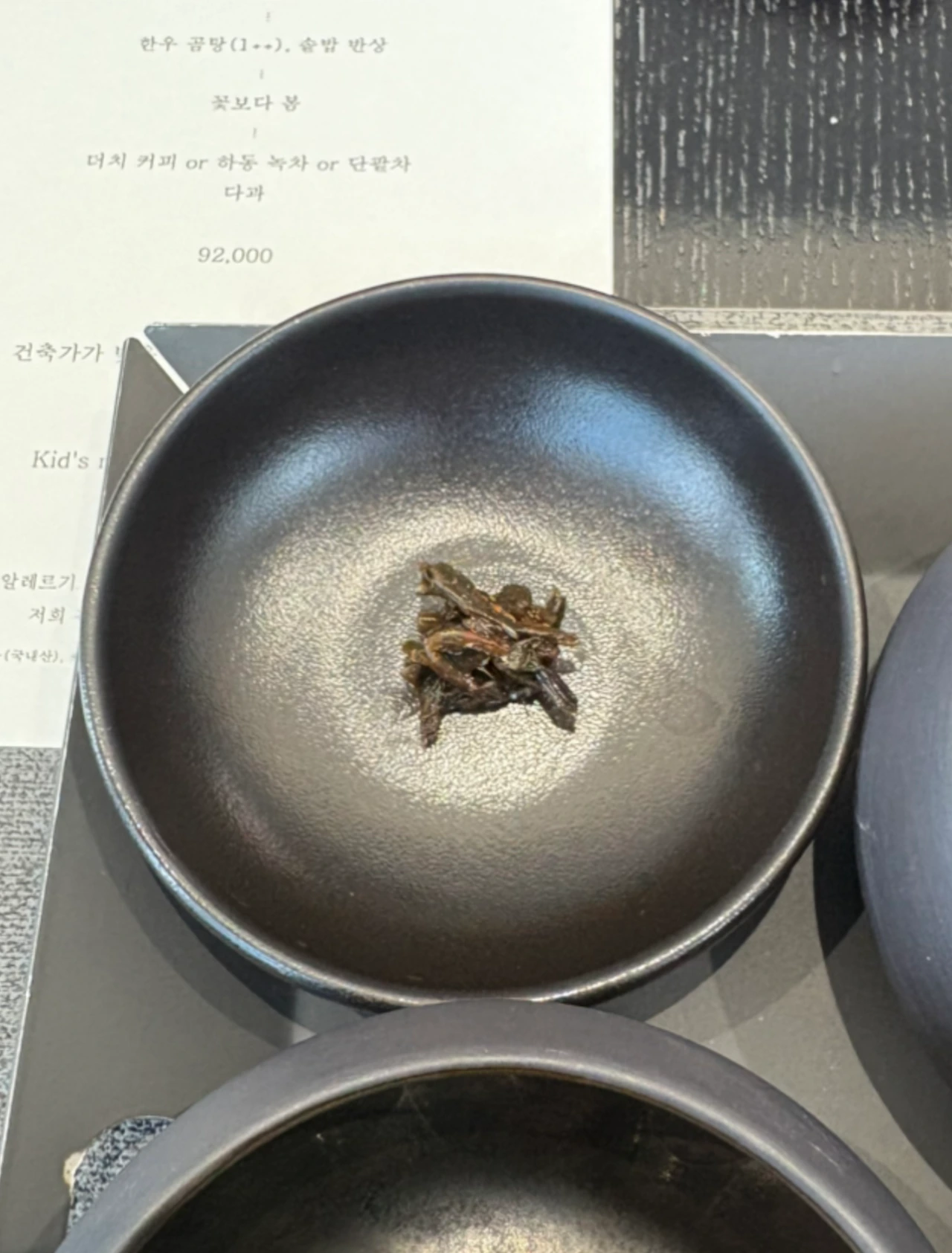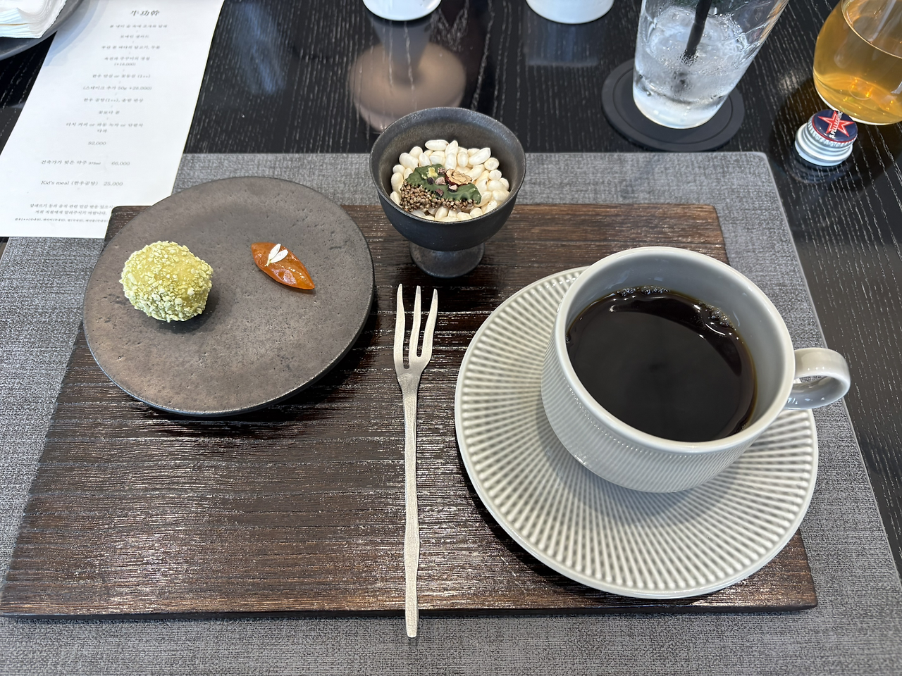 찹쌀 유과와 금귤 정과, 깨강정과 직접 내린 더치커피. 예전에는 금귤을 참 흔하게 먹었던 것 같은데 요즘은 보기가 힘든 것 같다. 여기에서 가장 감명 깊었던 것은 더치커피인데, 직접 내렸다고 하길래 처음에는 요즘 커피 맛있는 집이 흔한데 굳이 커피까지…?라고 생각했으나 먹어보니 더치커피 답지 않은 묵직함과 진한 풍미가 있어서 놀라웠다. 차는 커피, 녹차, 단팥차 중에 고를 수 있었는데 커피가 이렇게 맛있다니 다른 두 가지 차도 궁금하지만 다음에 오면 고민하다 또 커피를 시킬 것 같다는 생각이 들 정도로 맛있었다. 나는 더치커피에서 공통적으로 나는 특유의 향을 좀 싫어하는데 그 향이 느껴지지 않는 것도 신기했다.