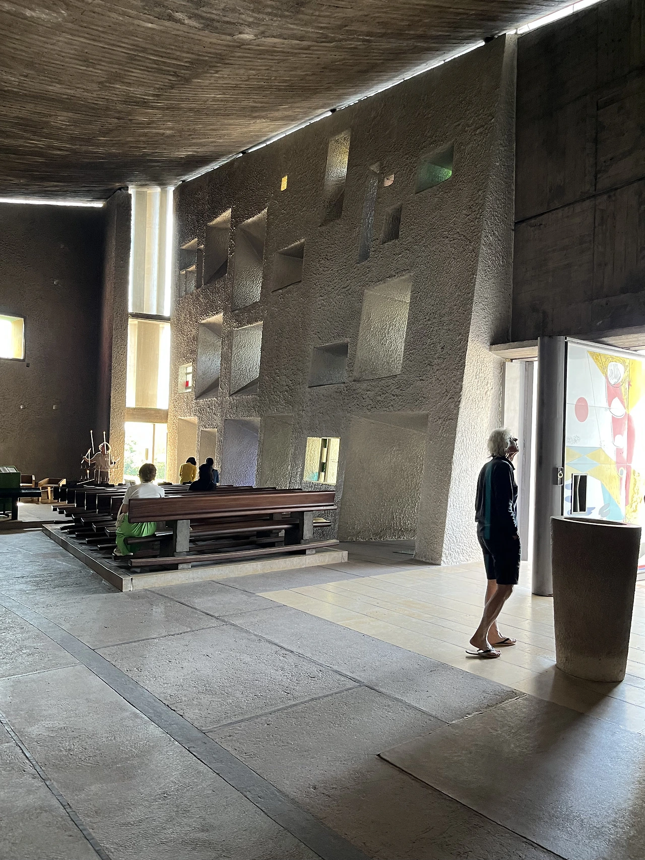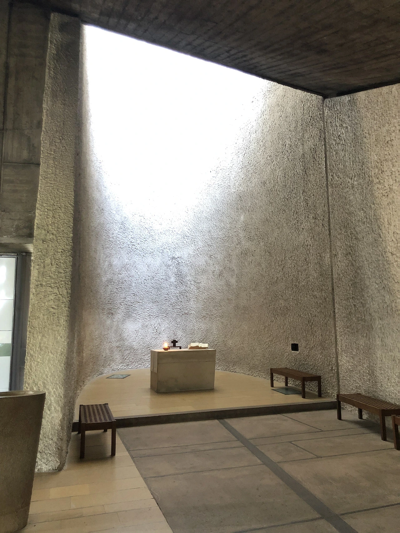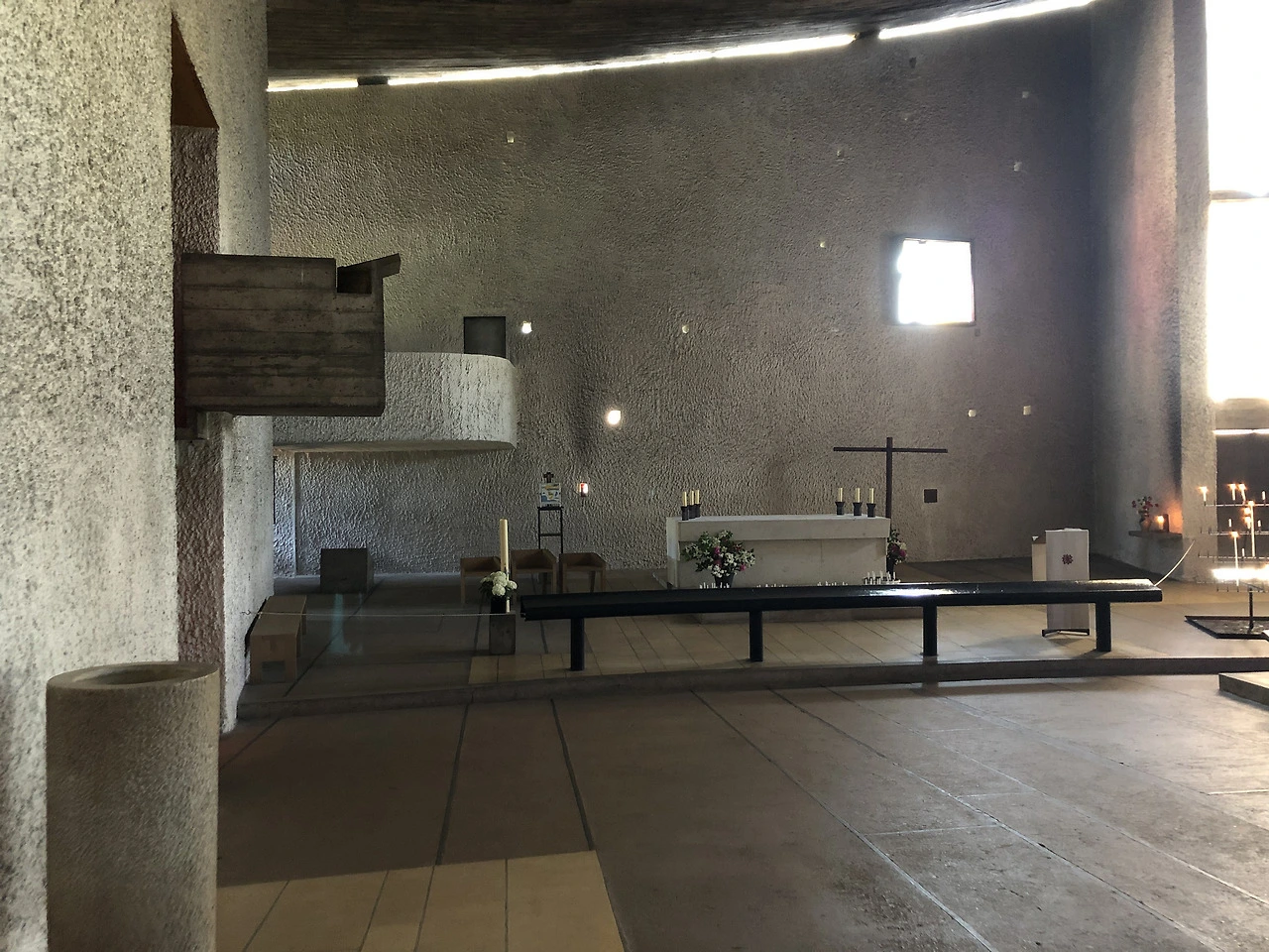 건물의 내부는 노출 콘크리트를 좋아했던 르 코르뷔제의 취향대로 스위스의 자연 날 것 그대로인 듯 거친 노출 콘크리트로 마감되어 있으며 대부분의 성당 건축에서 가장 신경 쓰는 부분 중 하나인 단상에서의 울림이 좋습니다. 크지 않고, 막힘이 없는 내부 구조이지만 구석구석 르 코르뷔제의 특징적인 기하학적 빛을 느껴볼 수 있는 곳도 있습니다.