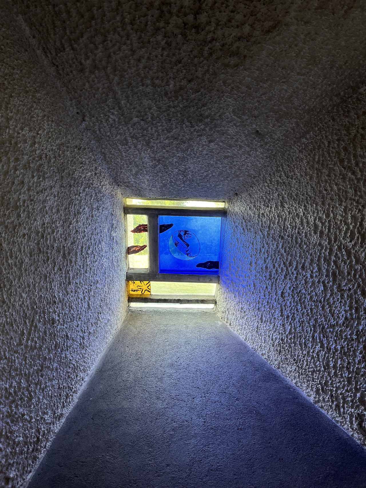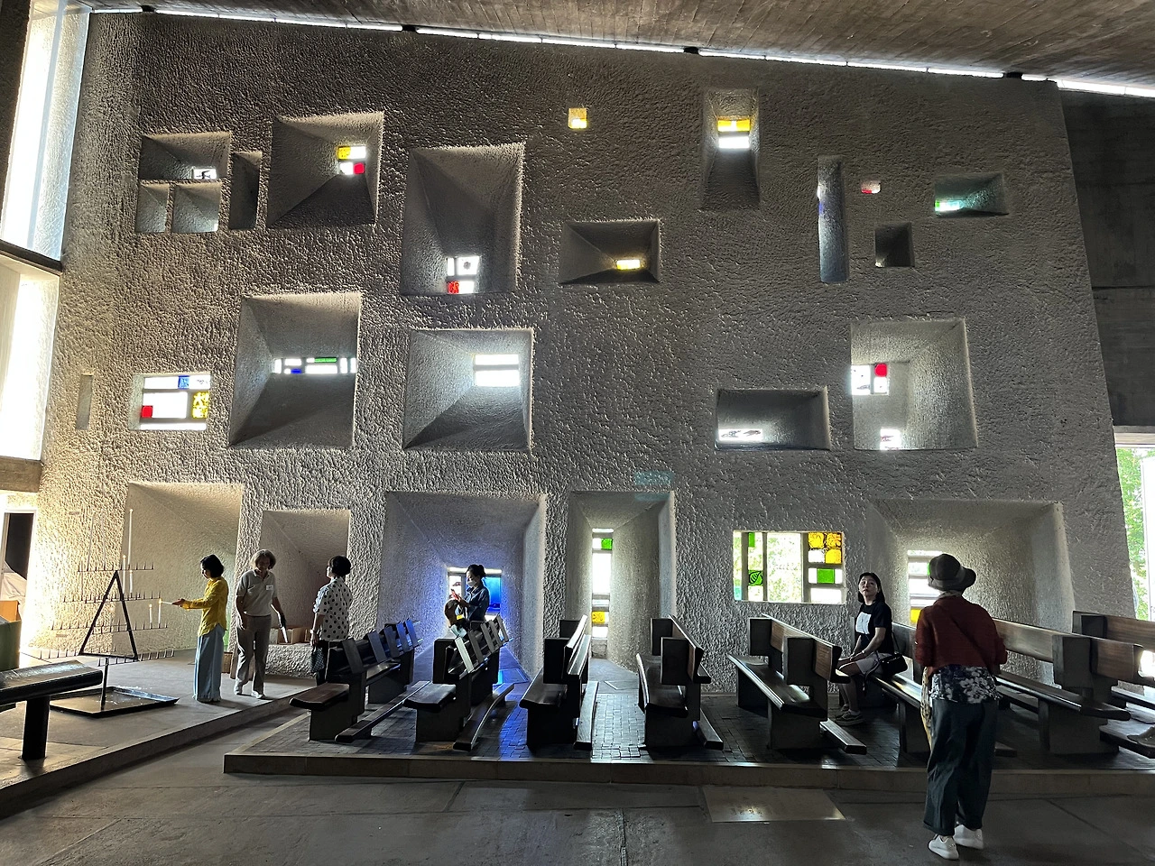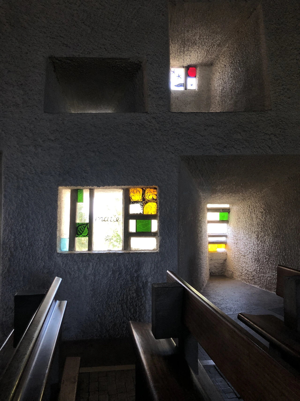 서로 다른 모양과 색의 창문을 통해서 들어오는 빛은 성당 안에 경건함을 더해줍니다. 비정상적으로 두꺼운 콘크리트 벽 역시 서로 다른 경사도의 창문 턱을 이루고 있어 밖에서 들어오는 빛들의 개성을 살려줍니다.