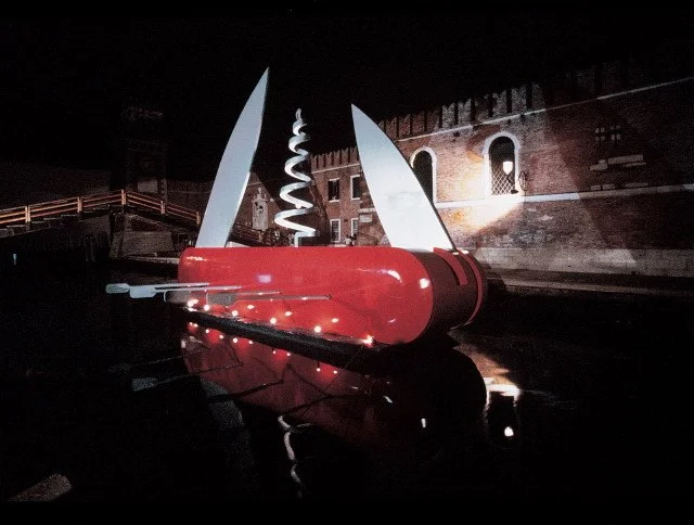 클라스 올덴버그는 스웨덴 출신의 조각가입니다. 1929년 스톡홀름에서 출생했지만 곧 미국으로 건너가 예일 대학에서 문학을 전공하고, 그 후 뉴욕으로 이주해 2022년 사망할 때까지 살았습니다. 코셰 반 부르겐은 큐레이터이자 미술학자로 1977년 올덴버그와 결혼 후 함께 작업해 왔죠. 1985년 베니스 비엔날레에서 이 부부는 커다란 스위스 칼 모양의 배를 타고 운하를 건너는 퍼포먼스를 해서 큰 주목을 받았습니다.