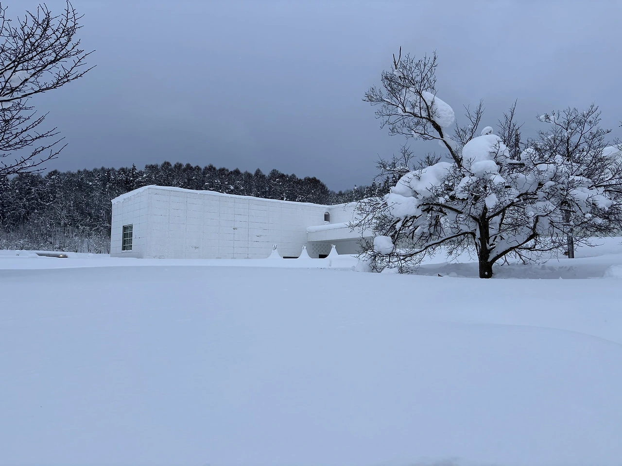 이번에는 연이은 폭설로 비교적 일찍 미술관을 나서야 했지만 해가 질 즈음이 되면 눈과 숲의 나라 아오모리를 상징하며 새하얀 미술관 벽에 초록색의 나무가 모여있는 조명이 켜지는 것을 볼 수 있습니다.
