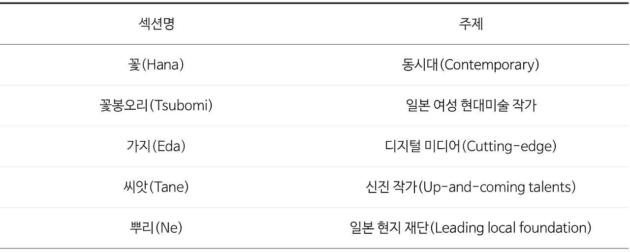 도쿄 겐다이의 특별 큐레이션 섹션은 "꽃(Hana)", "꽃봉오리(Tsubomi)", "가지(Eda)", "씨앗(Tane)", "뿌리(Ne)"입니다. 그들은 각각 신진 및 중견 작가 및 일본 여성 현대미술 작가, 아시아에서 중요한 인물, 디지털 미디어, 미술을 옹호하는 지역 재단을 집중 조명합니다.