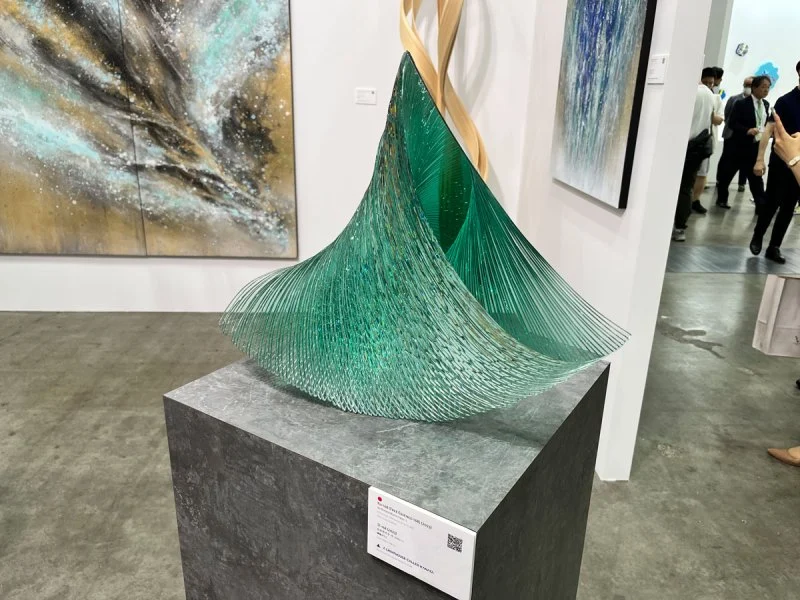 일본의 유리 공예 작가인 교토 기반의 니요코 이쿠타(Niyoko Ikuta)의 입체 작품은 페어가 열리고 채 한 시간이 되지 않아 바로 판매되었습니다. 정교하게 제작된 이 작품은 수작업으로 잘라낸 수십 장의 유리판을 사용하여 그릇 모양의 파도 모양을 만들고 있으며, 각도마다 완전히 다른 모습을 보여줍니다. 아름다움이 단 하나의 진실이라는 불교 원칙을 적용한 'KU' 시리즈는 작품에 대한 다양한 시각을 보여주며 갤러리에서 그 진실을 찾는 시리즈입니다.