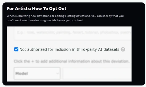아티스트는 AI 모델이 '드림업'과 타사 AI 모델 훈련을 위한 데이터세트에 자신의 작품을 사용하는 것에 대한 허용 여부를 선택할 수 있는 권한을 갖지만, 이 경우, 사용자가 직접 이미지를 하나하나 지워야 하기에, 팔머와 같이 플랫폼에 수천 개의 작업물을 가지고 있는 사용자에게는 이는 엄청난 부담입니다.