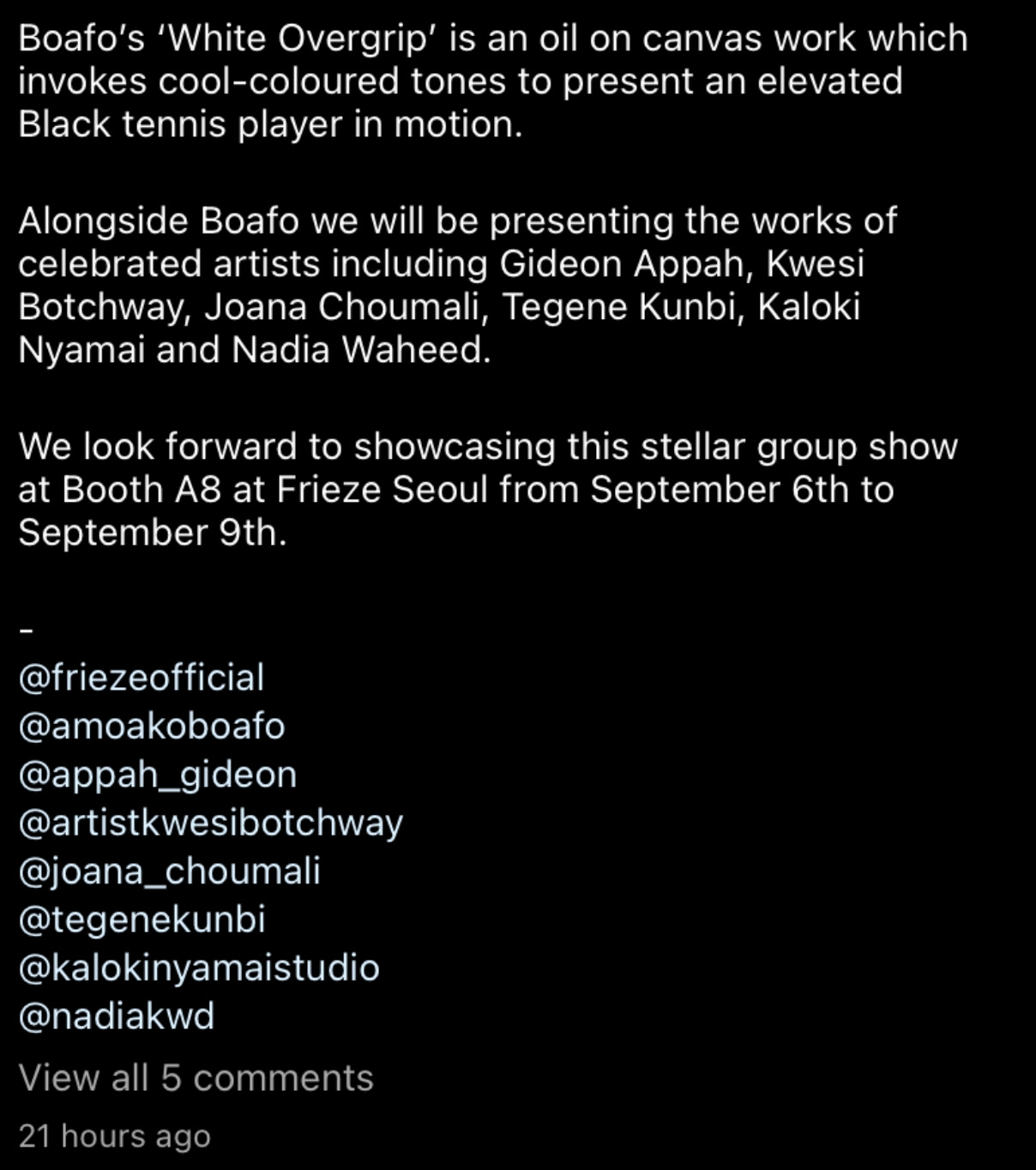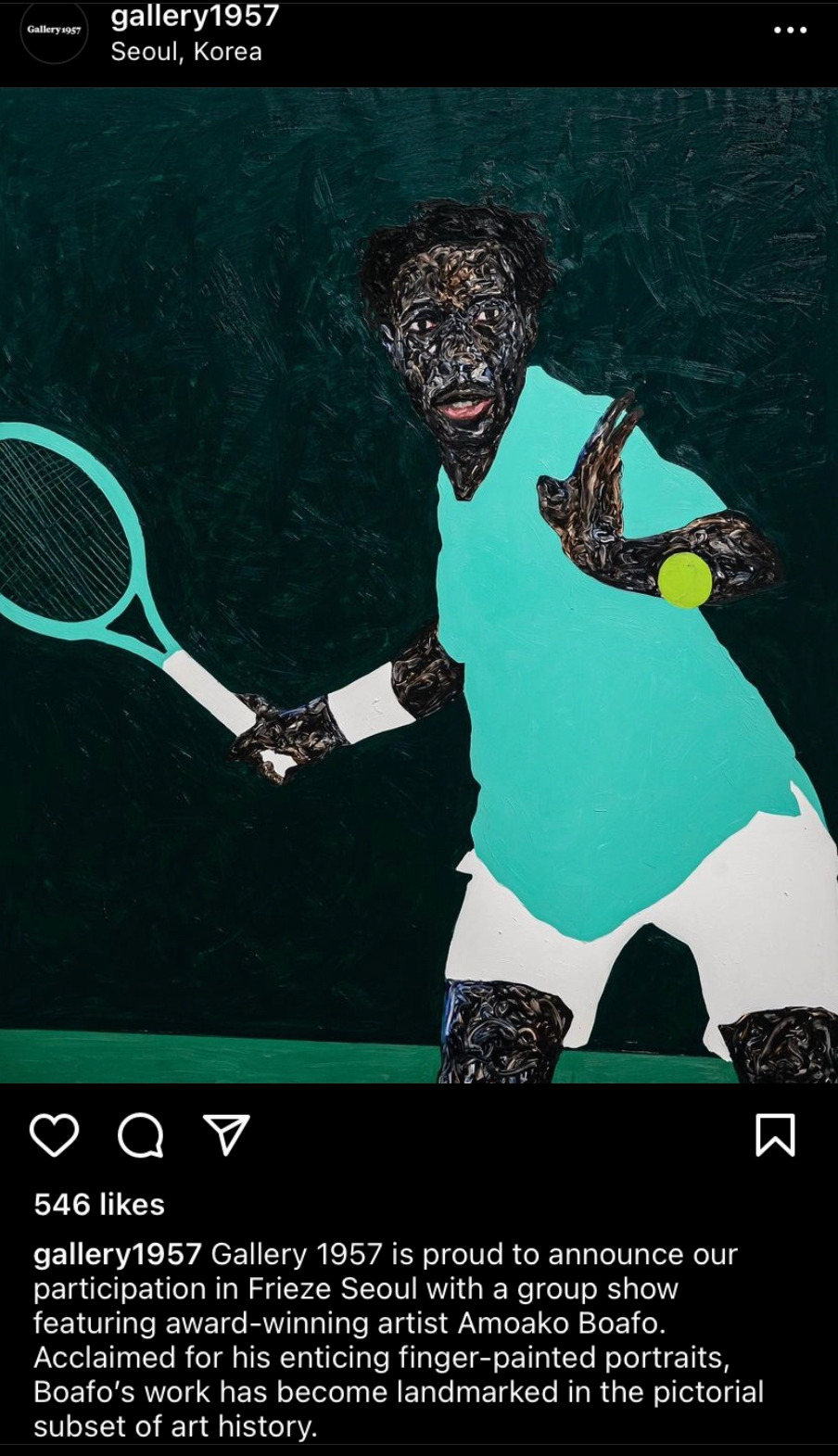 오는 9월 6일부터 9일까지 코엑스에서 열리는 FRIEZE SEOUL의 '갤러리 1957(Gallery 1957)' 부스 A8에서도 아모아코 보아포 외의 다양한 흑인 작가의 작품을 만나볼 수 있습니다!
