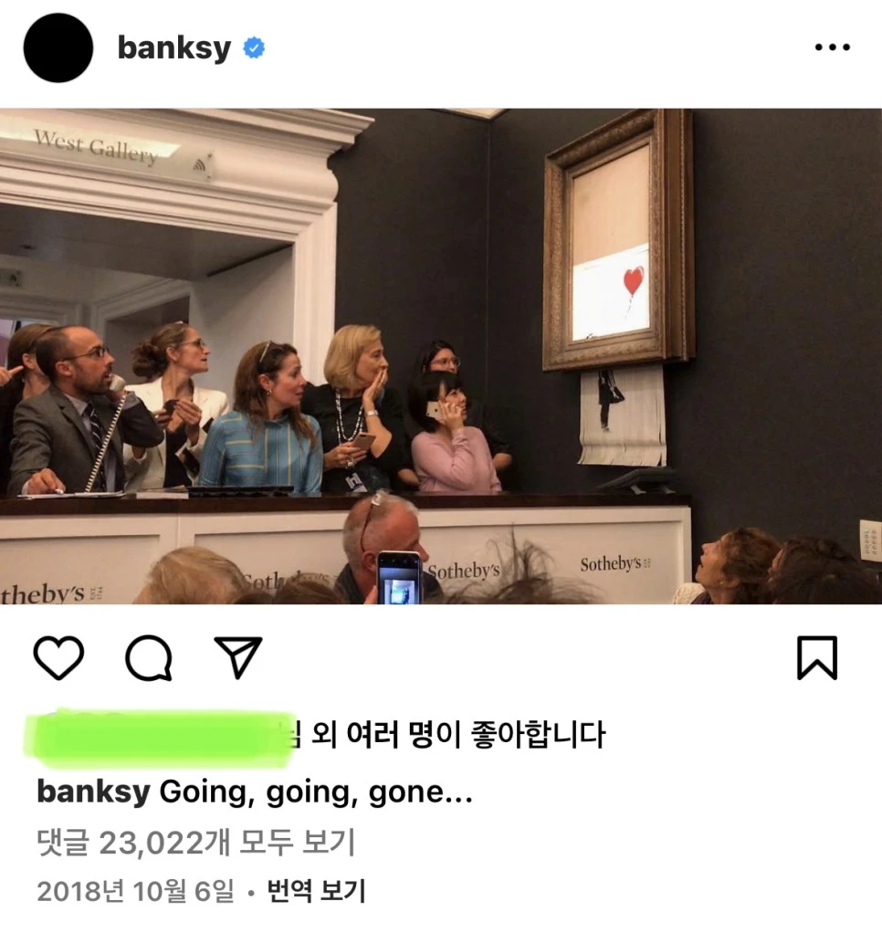 빨간 심장 모양의 풍선에 손을 뻗는 어린 소녀를 묘사한 파쇄된 작품은 3년 뒤인 2021년 10월 15일, 소더비 런던 이브닝 세일에서 무려 18배에 달하는 금액인 GBP 18,582,000(약 302억 원)에 재판매되었습니다.