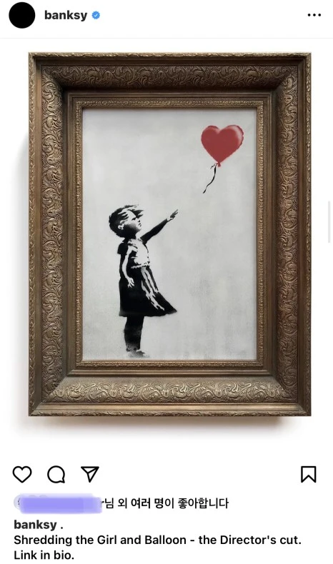 2018년 영국 런던 소더비 경매에서 이 작품이 GBP 1,042,000 (약 15억 원)에 낙찰된 직후, 뱅크시가 스스로 작품을 파쇄하는 해프닝으로 유명해졌습니다.