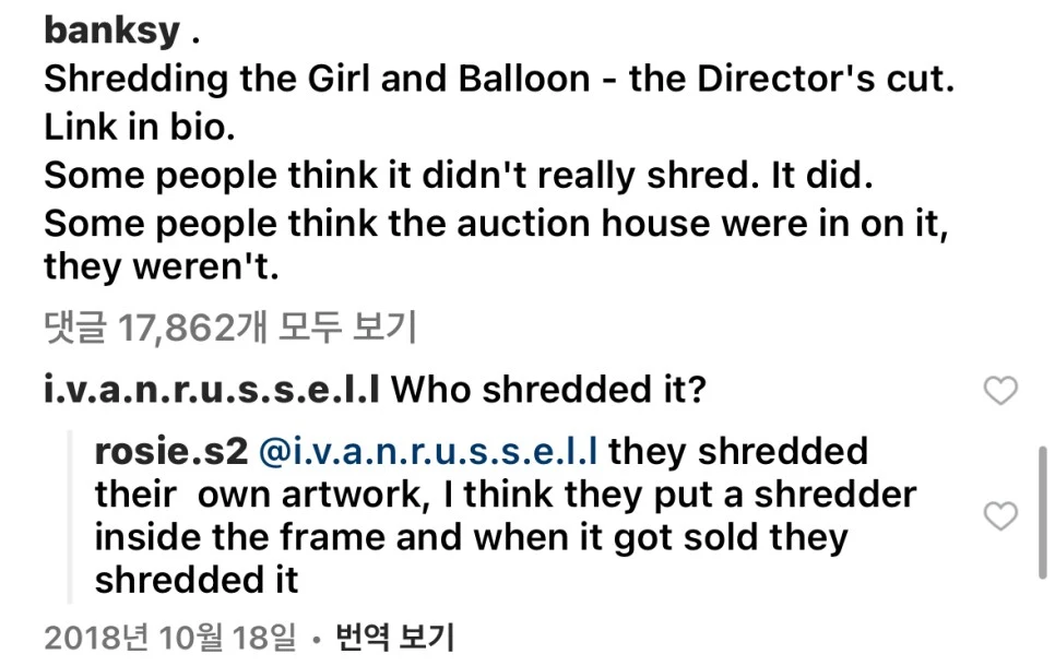 뱅크시는 해당 해프닝 이후 며칠 뒤, 액자 내부에 숨겨둔 파쇄기를 직접 작동시켜서 작품을 스스로 찢는 해프닝을 사전 계획한 사실을 그의 인스타그램 포스팅으로 알렸습니다.