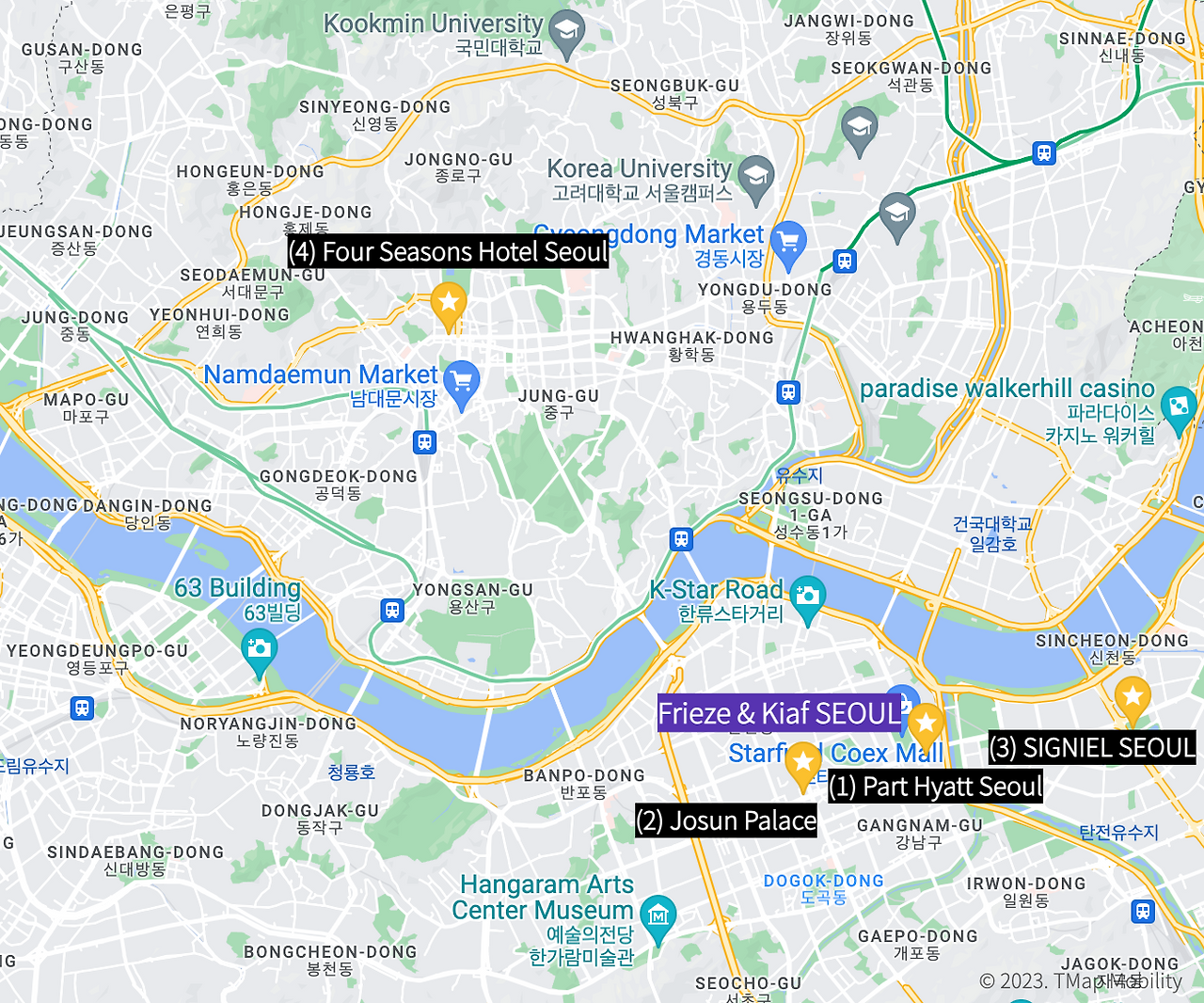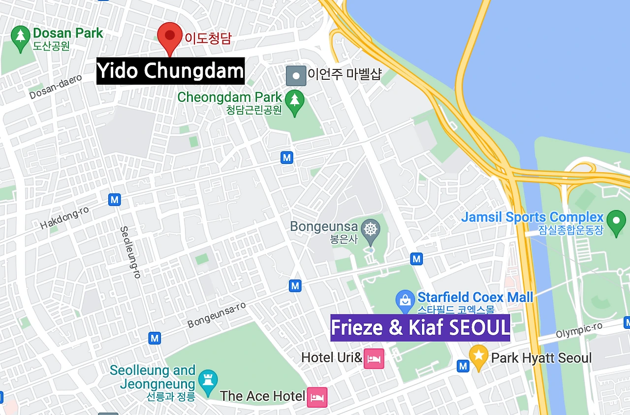 over two days during the Frieze Seoul period. Josun Palace, newly opened in 2021, is also just a 15 -minutes drive from Coex. Beyond art events, you can indulge in shopping or relishi Seoul's panoramic views from a high vantage point. Then SIGNIEL, situated conviently close to Coex presents an appealing option. Lastly, to explore and enjoy prominent domestic