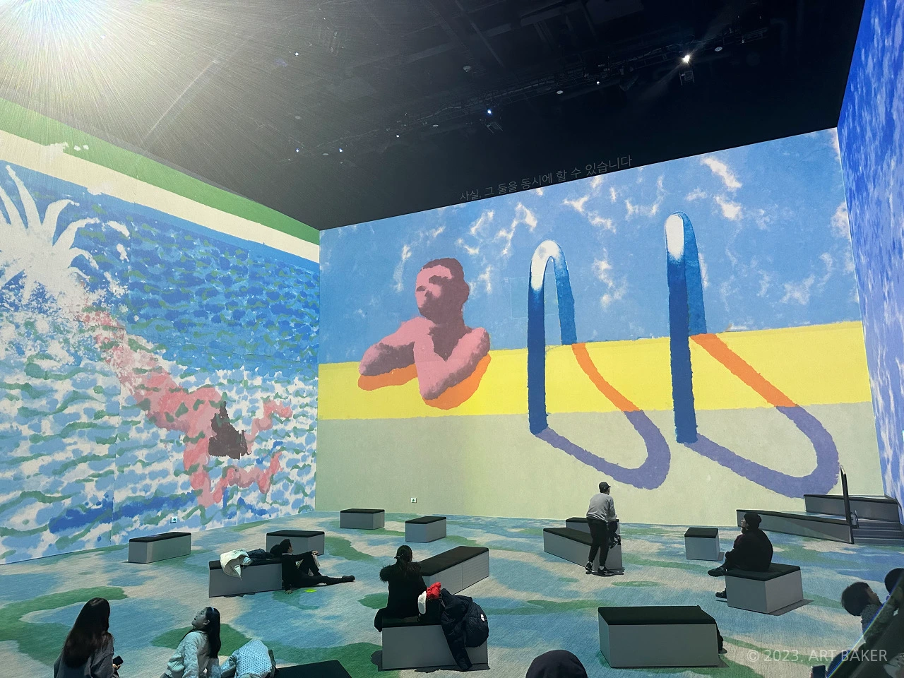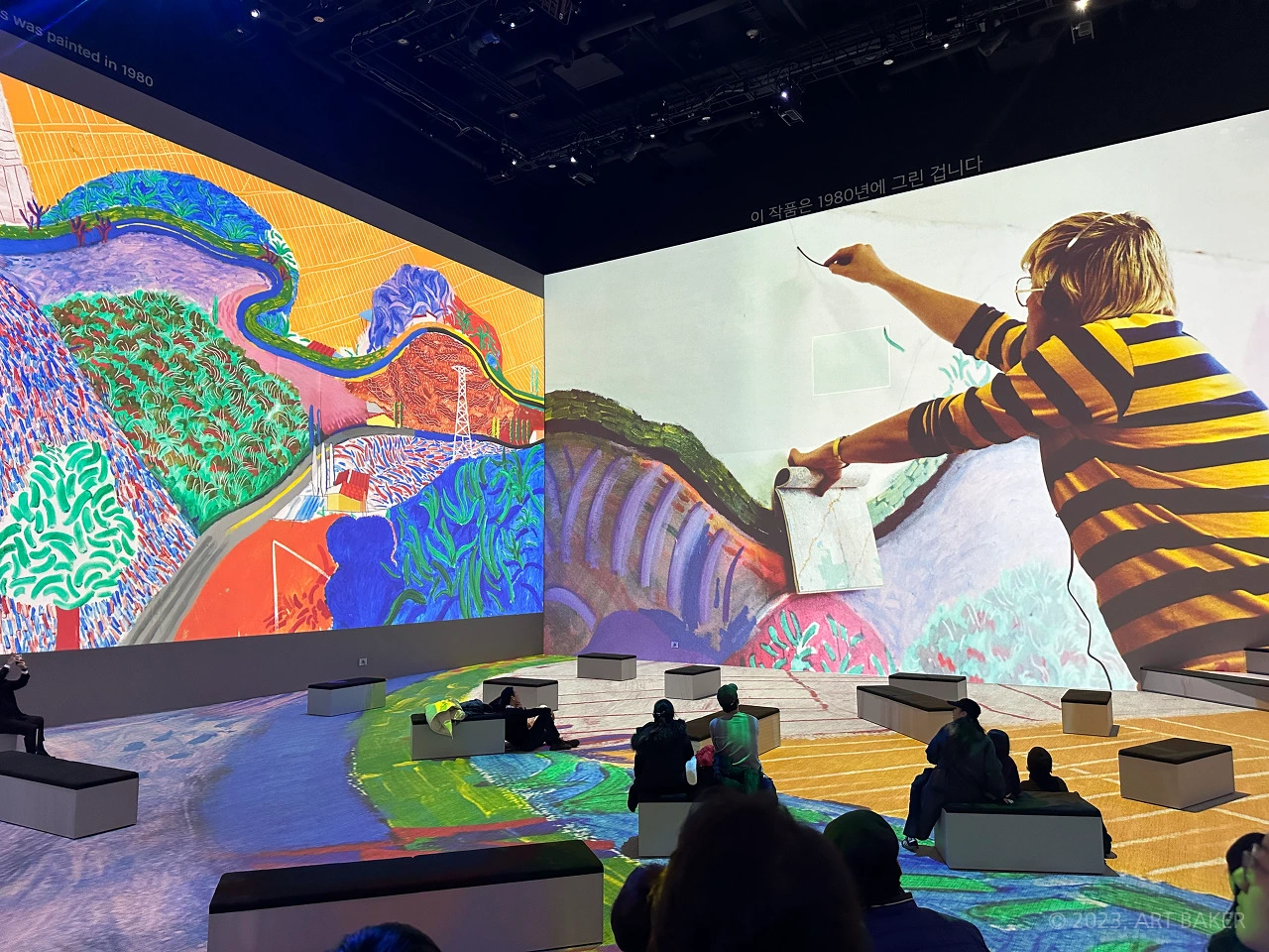 라이트룸 서울의 개관전에서는 현대미술의 거장 호크니가 주인공이 되었는데요. 라이트룸 서울에서 현재 전시하고 있는 '데이비드 호크니: 비거 앤드 클로저'는 지난해 영국 런던의 라이트룸에서 진행된 전시입니다. 에트나컴퍼니는 라이트룸 런던과 독점 콘텐츠 IP 계약을 체결하고 서울 강동구 고덕동에 가로 18.5m, 세로 26m, 높이 12m에 달하는 런던의 전시장을 그대로 구현한 전시장을 세웠습니다.