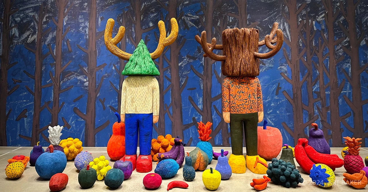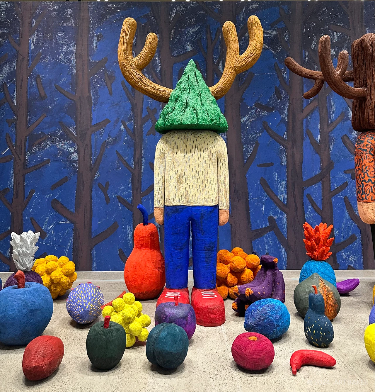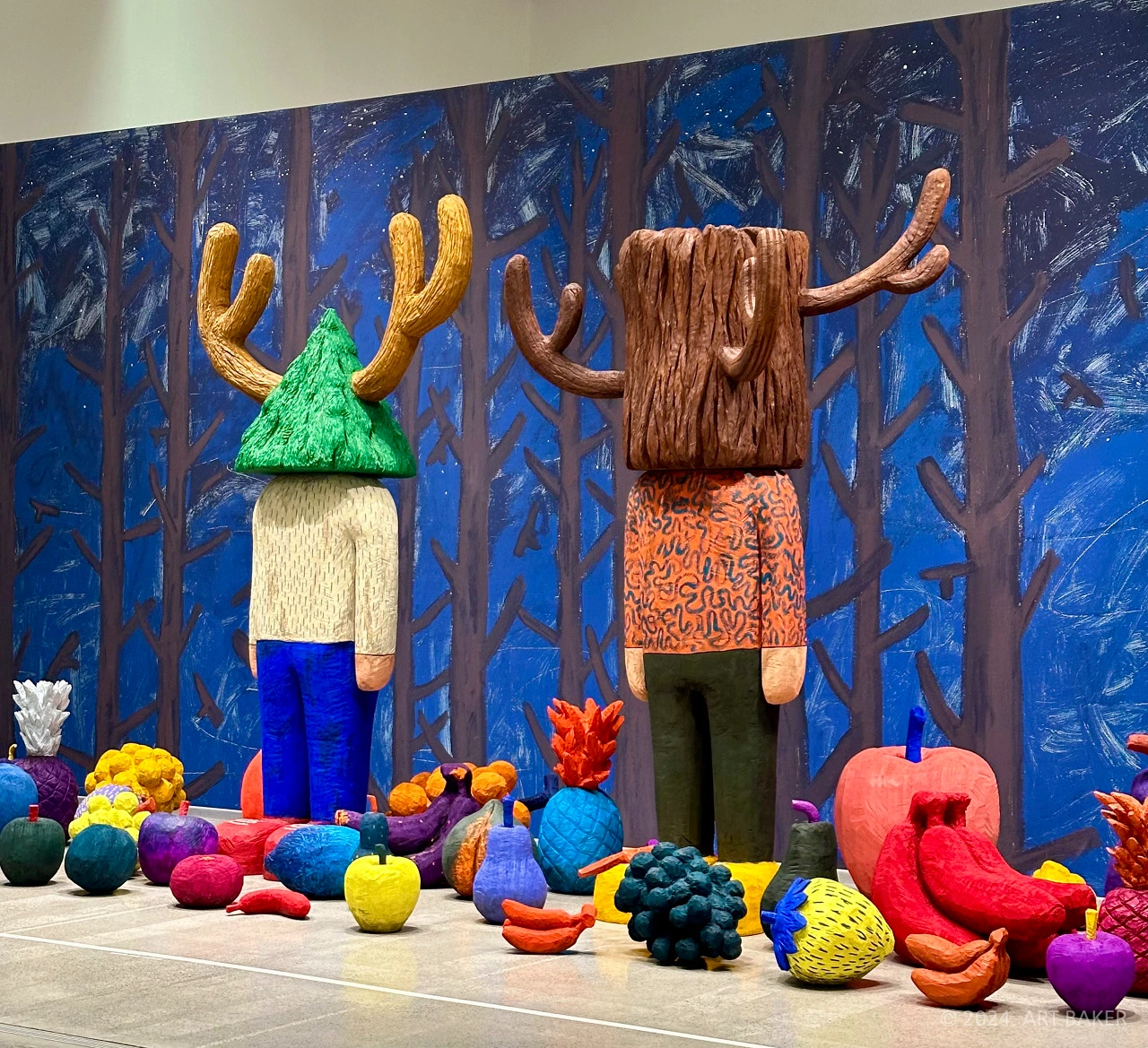 이번 전시에서 재미있었던 관전 포인트 중 하나는 바로, 유이치 히라코가 색감을 사용하는 방식이었습니다. 여기, 두 트리맨이 입은 옷도 참 감각적이고 재미있지 않나요? 게다가, 두 트리맨 주위에 놓인 과일들의 색감을 보세요!