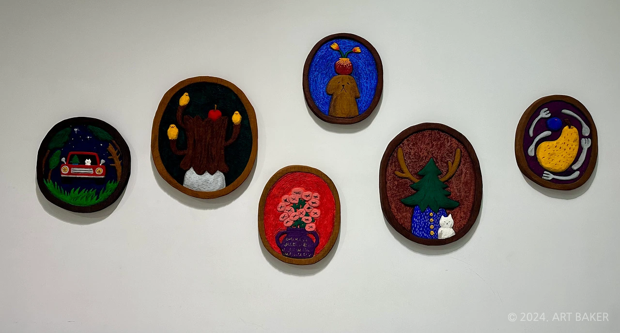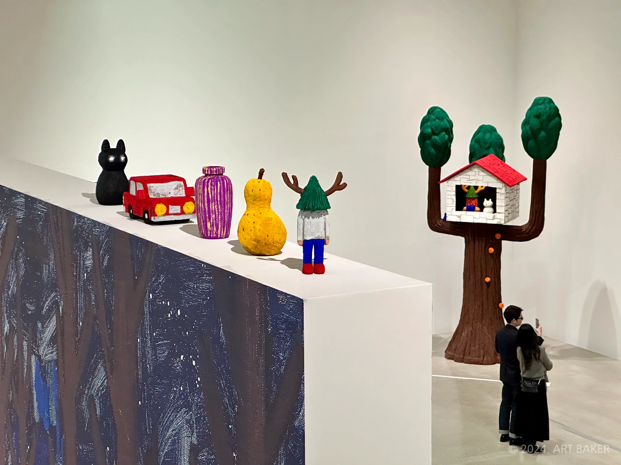 스페이스K 서울을 한 번이라도 방문해 보신 분들이라면 아는 깨알 관전 포인트가 하나 더 있죠. 바로 2층에서 내려다볼 수 있는 1층 전시장 전경입니다. 가벽 위에 줄지어 있는 까만 고양이, 빨간 자동차, 보라색 줄무늬 화병, 노란 배, 트리맨 등을 발견할 수 있었는데요.