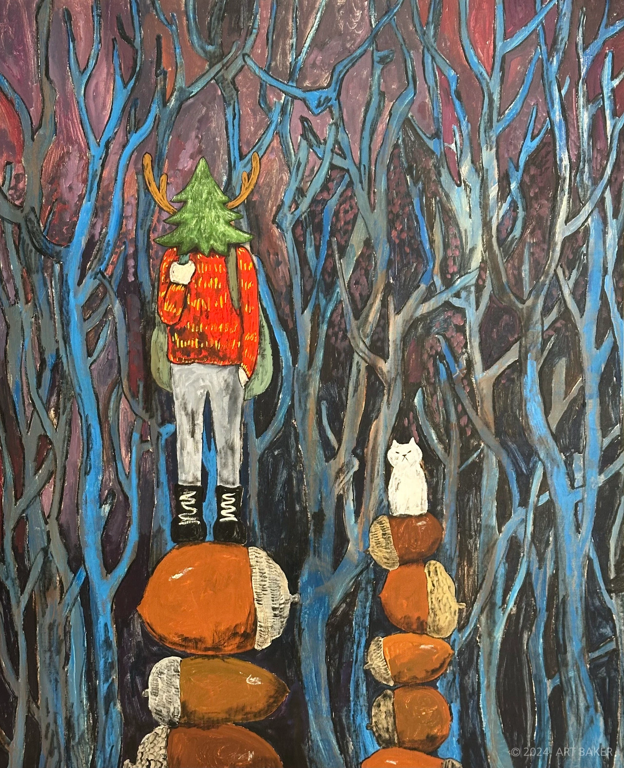 이번 전시에서 '트리맨'은 때로는 강가에서, 때로는 숲 속에서, 때로는 방에서 강아지, 고양이 그리고 다양한 식물들과 함께하는 여정을 펼칩니다.