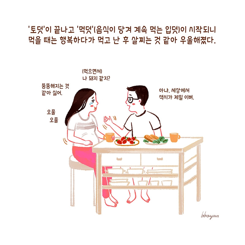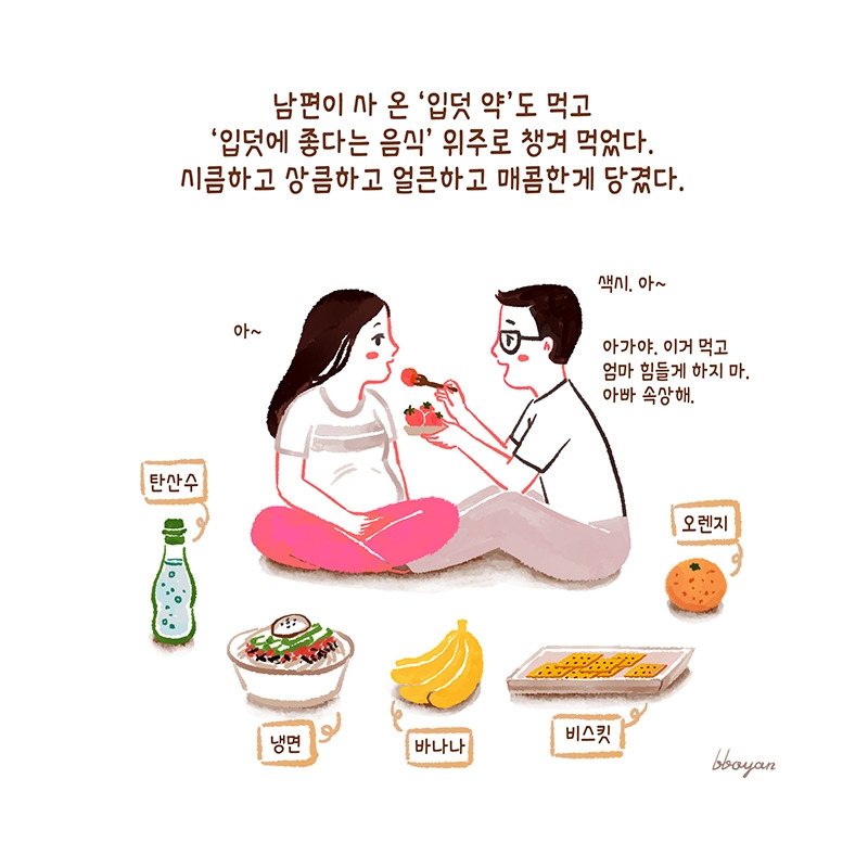 나는 ‘입덧'과 ‘먹덧'이 동시에 나타나 어떤 날은 음식이 입에 안 맞고 냄새조차 역겨워 하나도 못 먹을 때가 있고 어떤 날은 특정 음식이 당겨 너무 잘 먹는 날도 있었다. 계속 먹고 먹으니 몸이 거대해지는 같아 우울한 적도 많다. 토한 날은 기운도 없고 하루 종일 속이 쓰려 침대에 누워 아무것도 할 수 없었다.