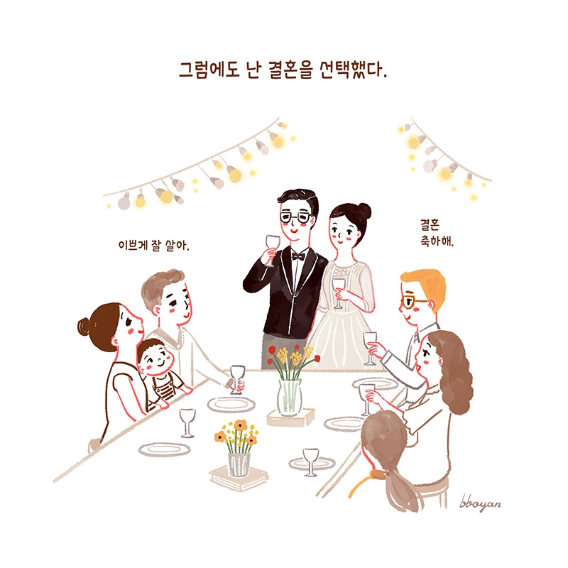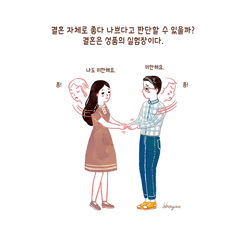 그럼에도 '결혼은 잘한 짓’이다. 세상에 완벽한 사람은 없고 우리 모두가 불완전한데, 온전히 내 편을 들어주는 누군가가 있으니 얼마나 든든한가. 티격태격 싸우면서도 내 모든 것을 지지해주며 같이 어려운 상황을 함께 헤쳐나갈 평생의 친구가 있으니 참 좋다. 짐도 함께 짊어지면 가볍다.