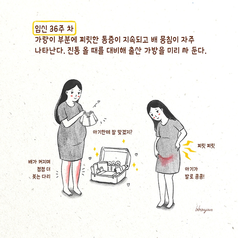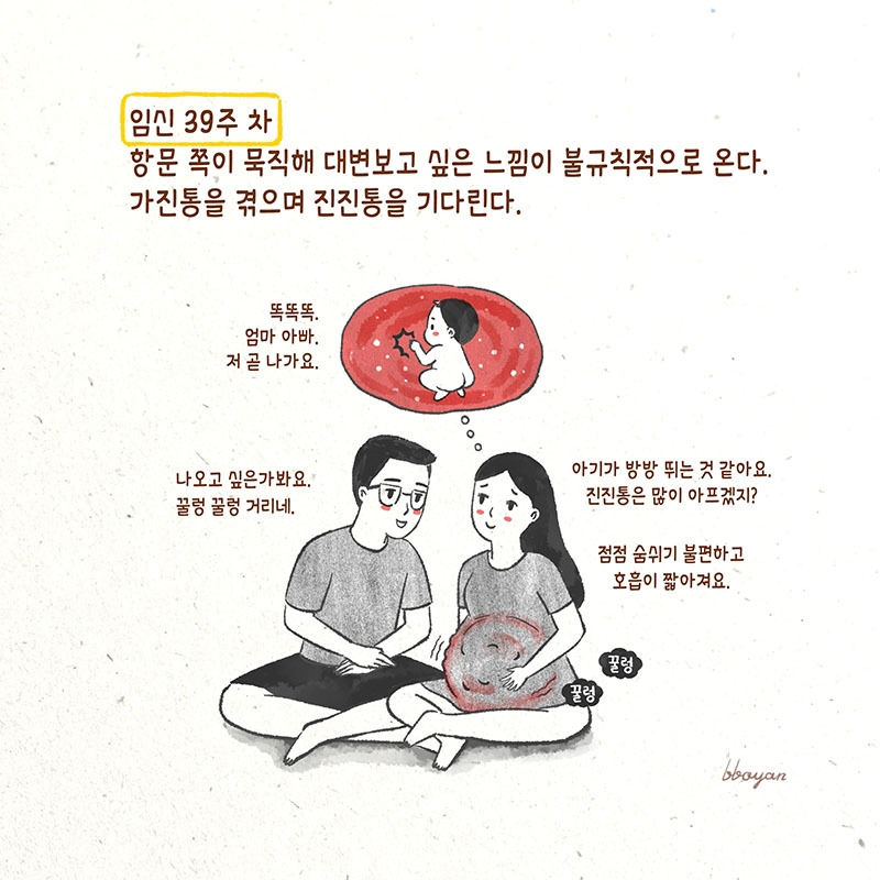 '아가야. 너는 잉태할 때부터 어떻게 나와야 하는지 알고, 뱃속에서 나오는 날도 스스로 정한다지? 드디어 방 뺄 마음이 생겼구나. 우리 잘할 수 있을 거야. 엄마가 온 힘을 다해 한방에 낳아 줄게. 조금만 아프자.'